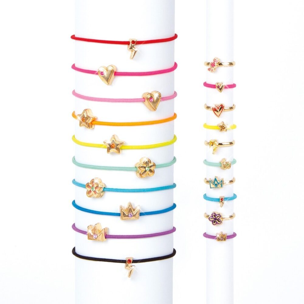 10 elastičnih narukvica sa privjeskom (srce, kruna, munja, cvijet i ostalo), 5 malih gumica za kosu i 5 prilagodljivih prstena – dovoljno da šarmiraš cijeli dan!