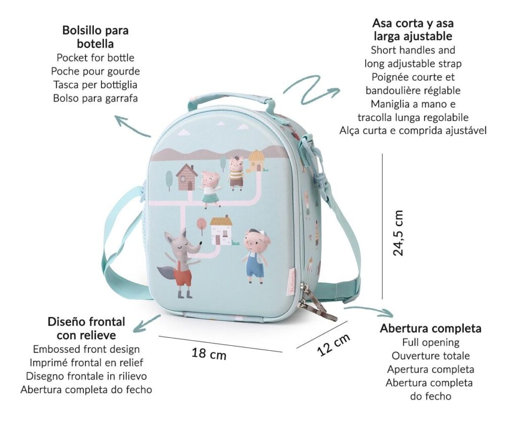 The Three Little Pigs Back to School Collection New 3D Insulated Snack Bag.Turn snack time into a moment full of magic and personality! This bag is perfect to take to school, to the park or on outings, ensuring that your little one’s snack stays at its ideal temperature for longer.On the front, a nice 3D picture with the characters from the Tutete Back to School 2025 collections stands out, and on the back it has a laminated label inside which you can write your name and data as well as add a photo or drawing.Its long adjustable strap allows you to easily carry it hanging over your shoulder and even crossbody, to make it more comfortable to carry.View all the lovely Tutete The Three Little Pigs collection items by clicking HEREFeatures3D design with embossed character on the frontComposition: 90% RPET + 10% PEVAHigh quality insulating inner materialDimensions: 24.5 cm high x 18 cm wide x 12 cm deepElastic mesh side pocket for bottle or accessoriesLaminated label on the back (10.5 x 6 cm) perfect to write the child’s name and details, or even place a photo or a personalized drawingZip closureShort upper handleLong adjustable strap to hang itClean with a damp cloth