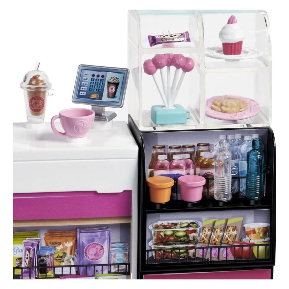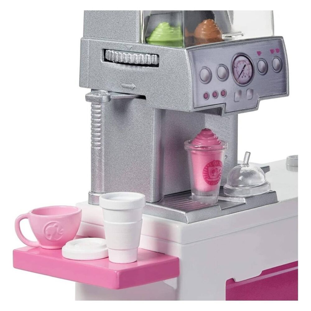 Set uključuje Barbie lutku, coffee shop i preko 20 dodataka za igru i zabavu. Barbie lutka nosi slatku majicu s prugama i ružičastu pregaču te joj je kosa svezana u punđu. Može pripremiti kavu, smoothie ili čaj za svoje goste. Barbie može poslužiti i slatke poslastice, vodu u bočici i još mnogo toga. Kada je narudžba spremna, Barbie zazvoni na svojoj blagajni! Neki od dodataka na sebi imaju kvačicu koja omogućuje Barbie lutki da ih drži za realističniju igru.