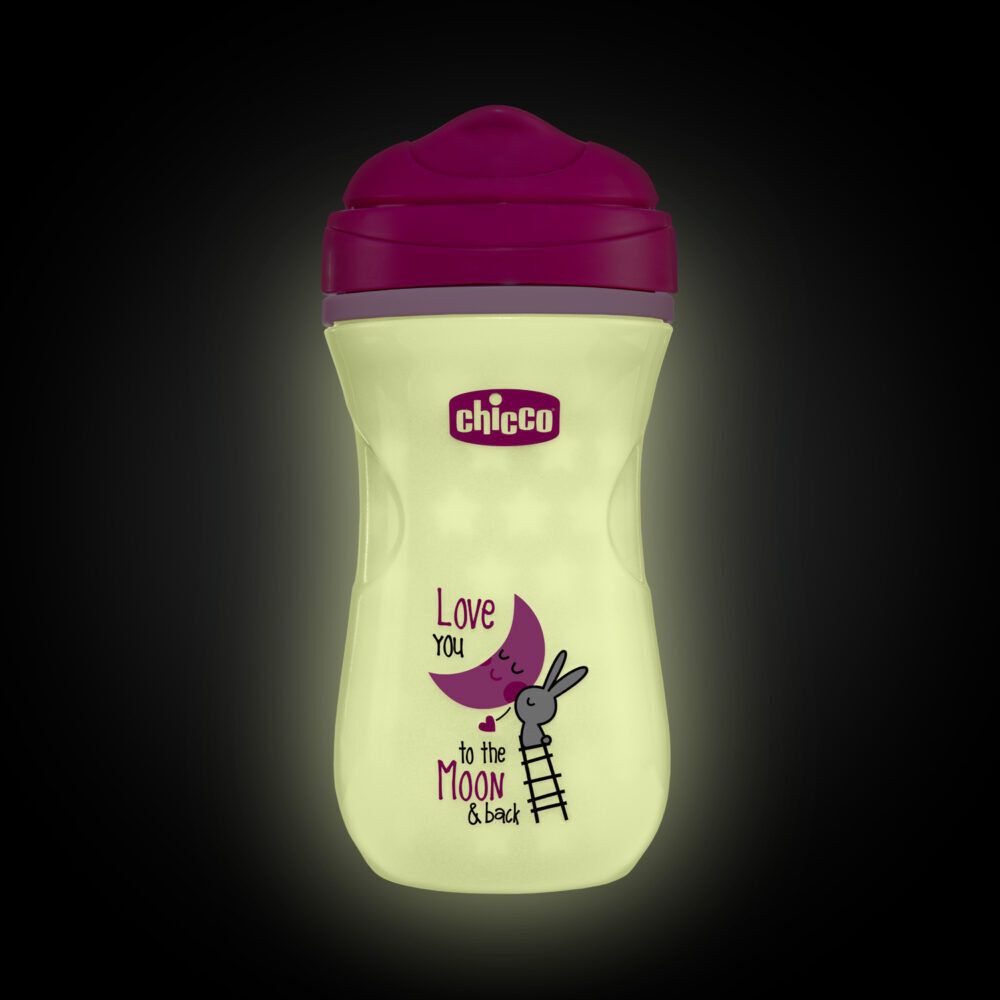 Chicco Shiny Cup je idealan za korištenje noću, pošto svijetli u mraku te ga dijete kao i roditelj mogu lakše pronaći. Tanki nastavak pruža osjećaj pijenja kao iz čaše, stoga je i lakši prijelaz sa bočice na čašu.