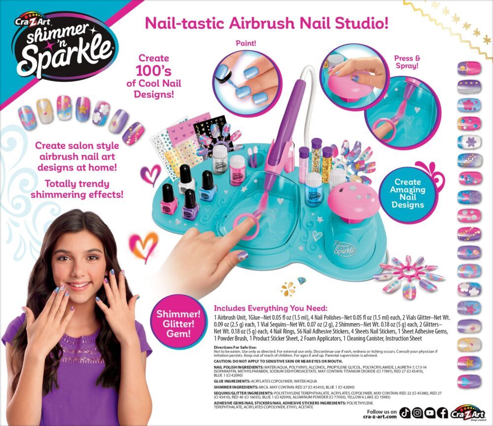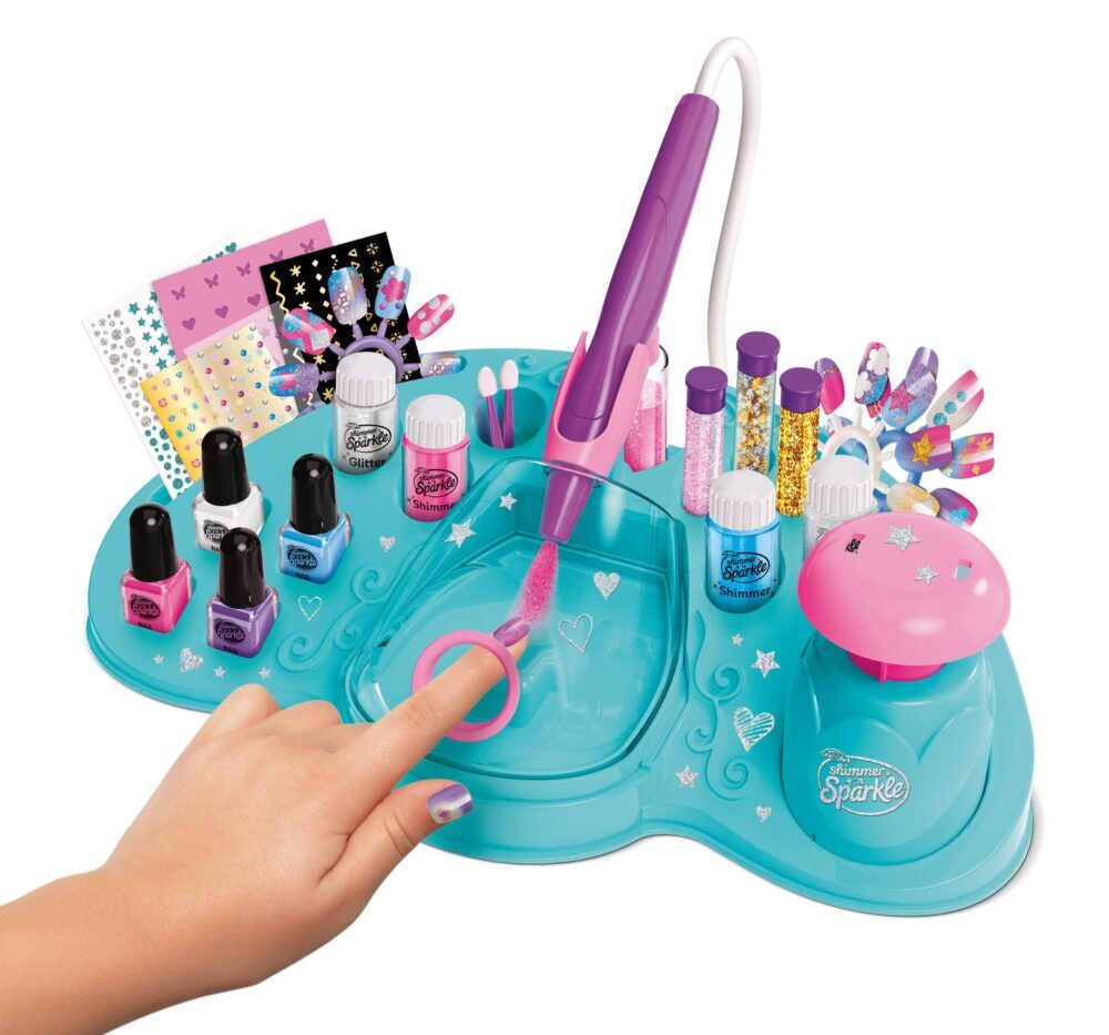 SALONSKI STIL KOD KUĆENapravite nevjerojatne kreacije za nokte kod kuće uz Shimmer N Sparkle Glitter i Shimmer Airbrush Designer. Stvorite 100 cool dizajna s potpuno trendi efektima svjetlucanja i svjetlucanja.LAKPrvo ispolirajte nokte jednom od uključenih boja u trendu kako biste stvorili prekrasnu bazu. Nalakirajte svoje nokte ili upotrijebite jednu od preša za nokte koja je uključena u set.SPREJSada je vrijeme za stvaranje nevjerojatnih efekata zračnog kista. Jednostavno stavite svoj svježe nalakirani nokat u kabinu za zračni kist, a zatim pritisnite pumpicu da raspršite svoju boju. Pomičite nokat po potrebi kako biste postigli željeni učinak.TOLIKO SVJETLUCAVIH DIZAJNAStudio uključuje niz svjetlucavih dodataka koji će vam pomoći u stvaranju blistavih dizajna za vaše nokte. Pospite šljokicama i stavite šljokice za dodatni sjaj ili dodajte naljepnice za nokte i dragulje za potpuno trendovski završetak.POTIČE KREATIVNU IGRUDjeca mogu postati pravi umjetnici noktiju i svidjet će im se mogućnost stvaranja raznih nevjerojatnih dizajna noktiju zračnim kistom. Mogu se jako zabaviti usavršavajući svoje vještine nail arta te stvarajući i dijeleći razne trendi lookove.Dob 8+ god.