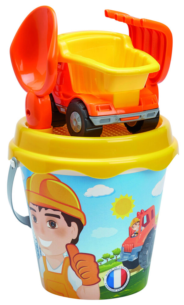 Kanta sa sadržajem; kamion, lopata, grablje i sita.