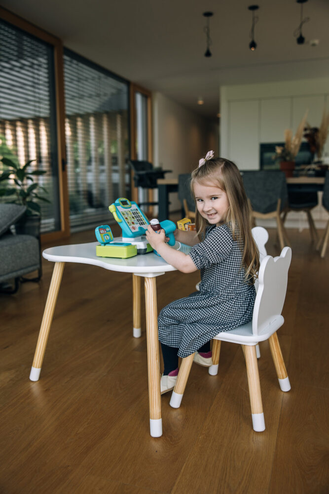 Igranje uloga vrlo je važno za djetetov razvoj jer potiče djetetovu maštu i komunikacijske vještine, a ujedno je i jedna od omiljenih dječjih igara.Dječja blagajna prilagođena je djeci od 3 godine. Radi uz pomoć baterija.Ima: