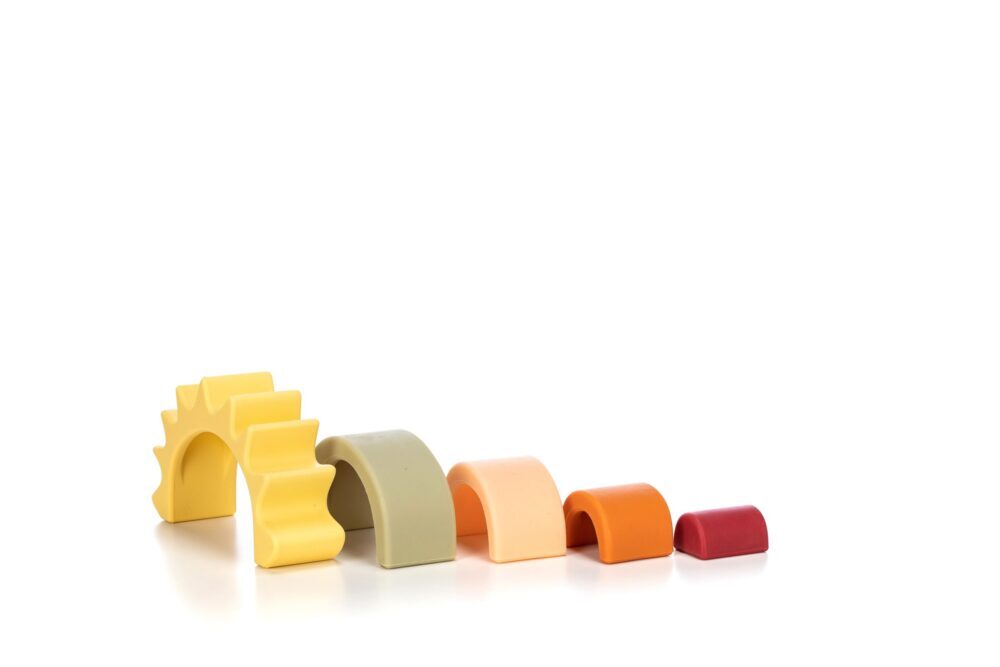 U pakiranju se nalazi 5 različitih silikonskih građevnih blokova koji se mogu slagati jedan na drugi/jedan u drugi/jedan iza drugog. Svaki građevni blok različite je boje i veličine.