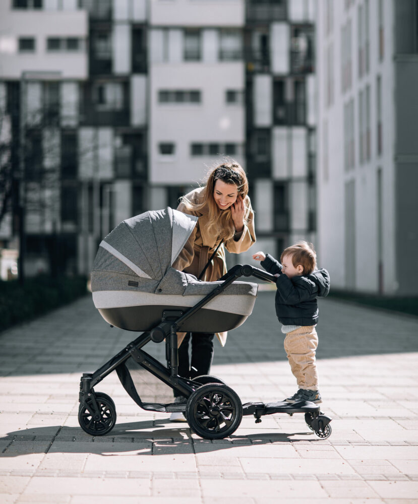 Buggyboard s aluminijskom konstrukcijom i izdržljivim plastičnim dijelovima pogodan je za upotrebu na gotovo svim europskim kolicima.