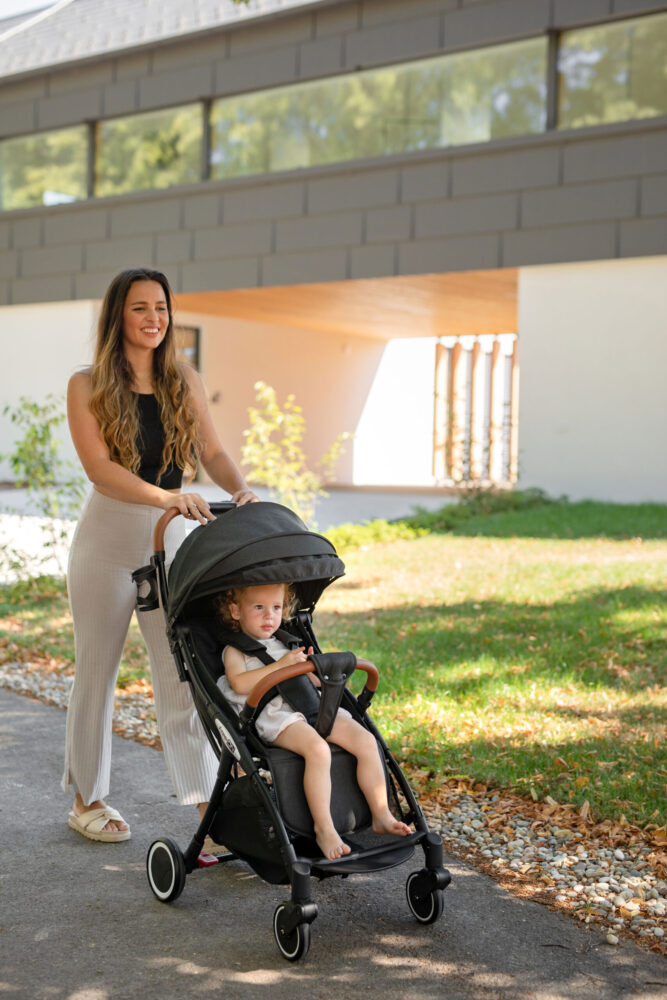 Kolica odlikuje kompaktna aluminijska konstrukcija koja se lagano i jednostavno sklapa pritiskom jednog gumba. PU kotači kojiublažavaju vibracije prilikom vožnje po različitim terenima. Kolica su primjerena za različite vremenske prilike, a produžen krović dijete štiti od sunca i vjetra.