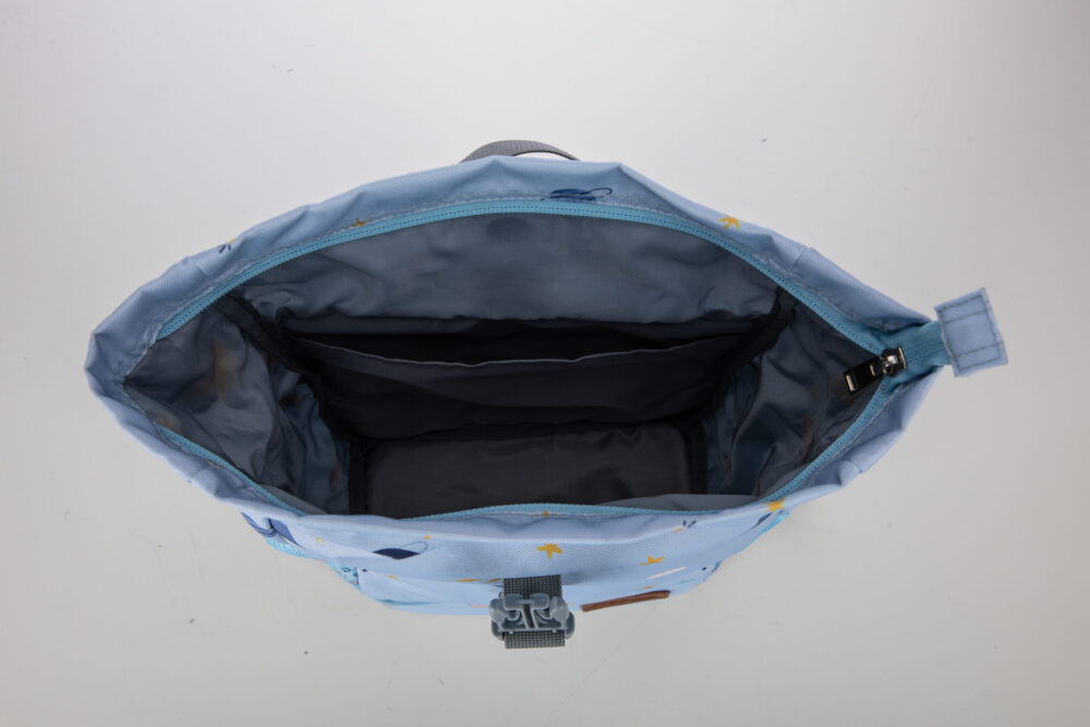 Dječji ruksak sa simpatičnim motivom. Ruksak ima dva pretinca s patentnim zatvaračem, jedan veći i jedan manji sprijeda. Ima podesive mekane podstavljene naramenice i udobna mekana podstavljena leđa. Ruksak ima kopču koja sprječava da naramenice skliznu s djetetovih ramena. Izrađena je od izdržljivog i visokokvalitetnog materijala. Dimenzije 24x15x26 cm.