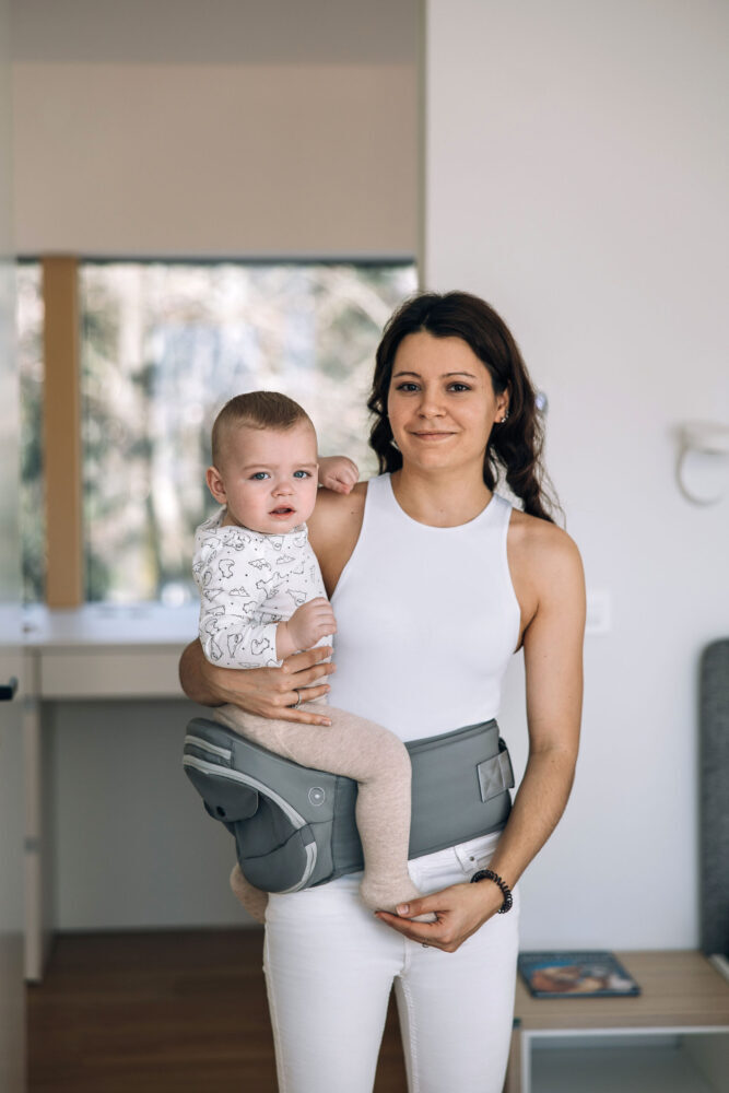 U prvim mjesecima, dok se bebin zglob kuka još razvija, neophodno je nositi bebu u nosiljci u pravilnom položaju. Ovaj položaj ne samo da je najbolji za razvoj kukova i kralježnice, već je i najudobniji za bebu. Zahvaljujući potpori i položaju nožica, i bebina kralježnica je u pravilnom položaju. Za ugodnije nošenje i odmor u krilu, potpora za glavu sprječava pad glave u stranu. Osigurava ispravan način nošenja jer su djetetove noge tijekom nošenja u ispravnom M položaju.