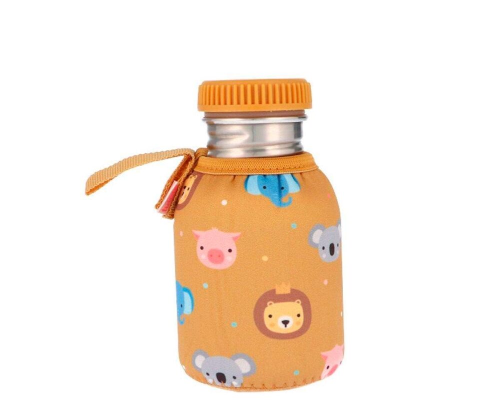 Neoprene sleeve to protect the steel bottle.It can be customized with the name, in uppercase, on the handle. FeaturesRemovable neoprene sleeveWith a velcro handle to hang on the backpackNeoprene: Hand wash with cold water and mild soapThe neoprene sleeve helps maintain the temperature longerSteel bottle not included
