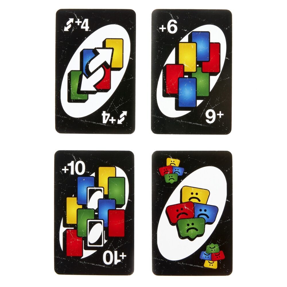 UNO Show ’em No Mercy naša je najbrutalnija UNO igra dosad! Sadrži 168 karata što je 1.5 standardnog špila UNO karata. Ima gomilu karata s PUNO strožim kaznama (je li netko izvukao 10 karata?) i novim pravilima prema kojima će igrači slagati, mijenjati i izvlačiti više karata nego ikad prije! A postoji čak i Pravilo milosrđa (da, shvaćamo ironiju) ako stvari postanu pregrube. Postoje dva načina za pobjedu u ovoj nemilosrdnoj verziji klasične igre: riješite se svih karata ILI izbacite sve ostale igrače iz igre! Oh, i ako uspijete doći do jedne karte, ne zaboravite viknuti ‘UNO!’