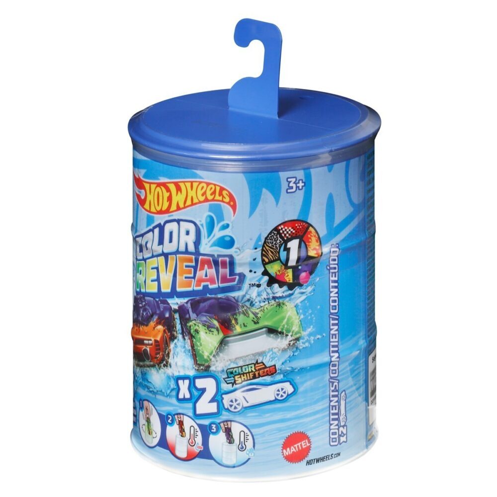 Unutar pakiranja koje podsjeća na bačvu, nalaze se 2 Hot Wheels Color Reveal autića u mjerilu 1:64 prekrivena posebnim premazom Color Reveal.