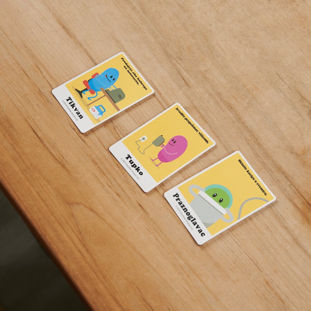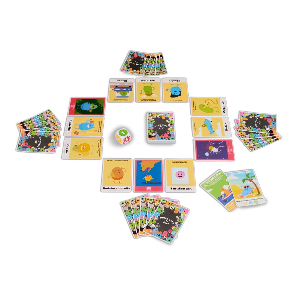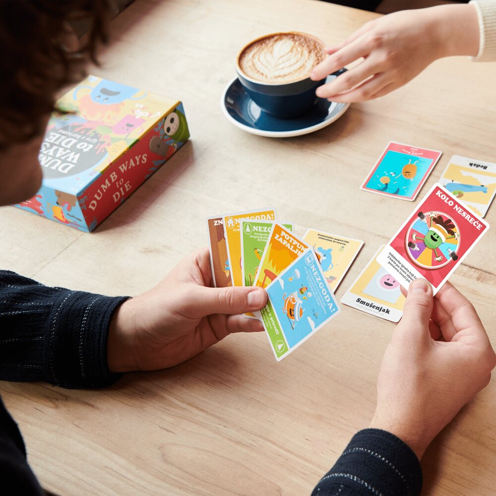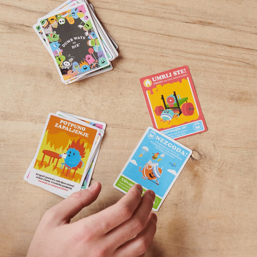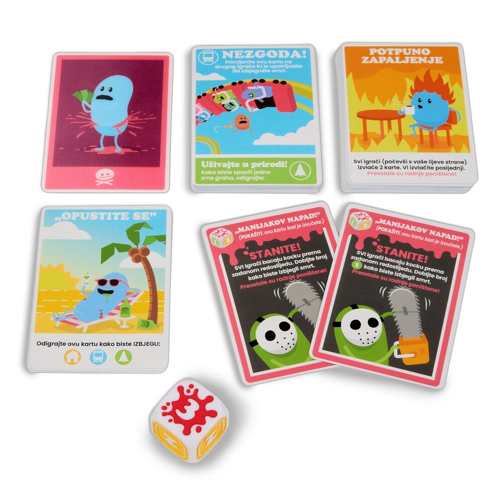 Dumb Ways to Die kartaška igra donosi poznate likove iz istoimene masovno popularne aplikacije u zabavnu, brzu i nepredvidivu formu društvene igre. Igrači pokušavaju zaštititi svoje graškolike likove od – najglupljih mogućih načina da stradaju, dok im karte više odmažu nego pomažu. Zahvaljujući jednostavnim pravilima, brzom tempu i dozi crnog humora, ova igra postaje hit među tinejdžerima i odraslima. Idealna za obiteljske večeri, druženja s prijateljima i sve koji vole party igre s dozom apsurda. Igra je prevedna na hrvastki jezik. Sadržaj pakiranja: 70 karata, upute za igru. Broj igrača: 2–5. Preporučena dob: 12+ godina
