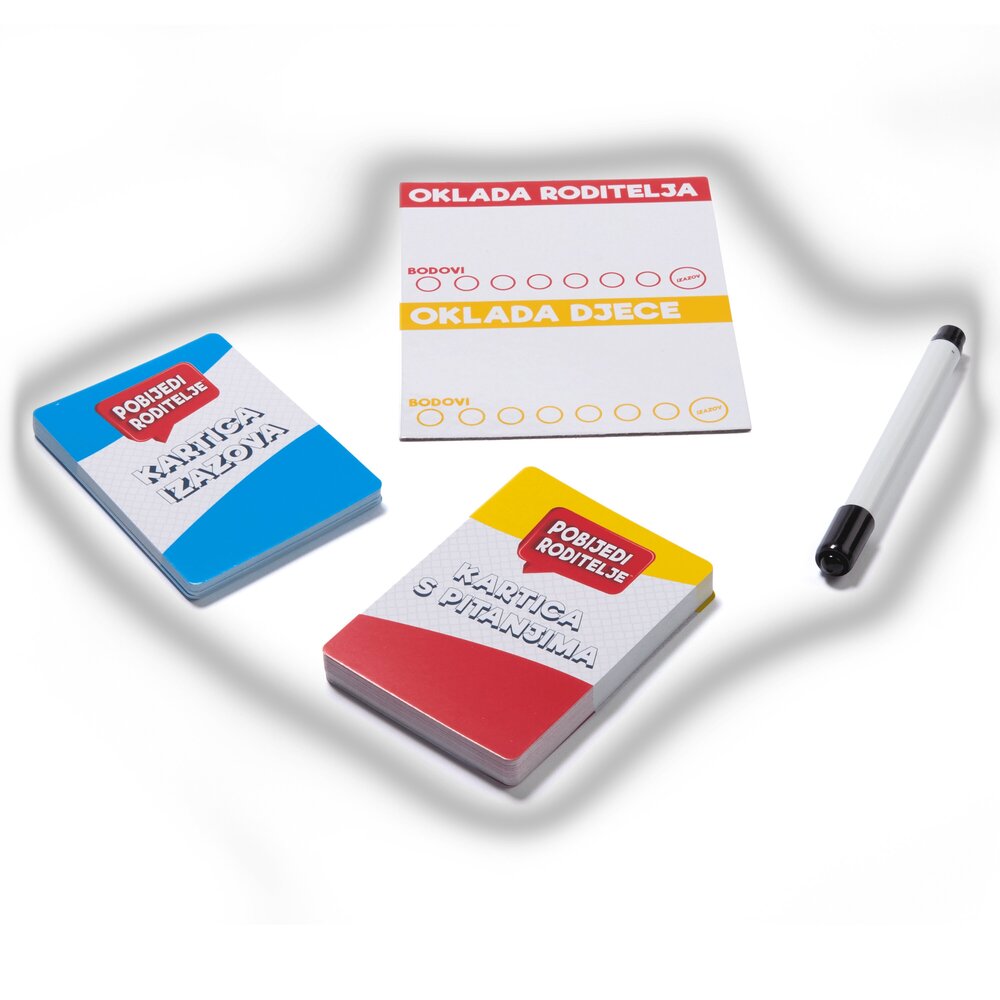Brza obiteljska igra s puno smijeha i izazova! Pobijedi roditelje – brza igra donosi ubrzanu verziju popularne klasične igre u kojoj djeca i roditelji napokon mogu odmjeriti snage! Timski izazovi, pitanja za djecu i odrasle, zabavne oklade i puno navijanja pretvaraju svaku večer u urnebesno natjecanje. Savršeno za obiteljske trenutke puni akcije, smijeha i malih osveta! Sadržaj pakiranja: 1 blok za bodove i oklade, 1 flomaster, 1 špil kartica izazova, 1 špil kartica s pitanjima. Broj igrača: 2-6. Baterije: ne. Preporučena dob: 6+.