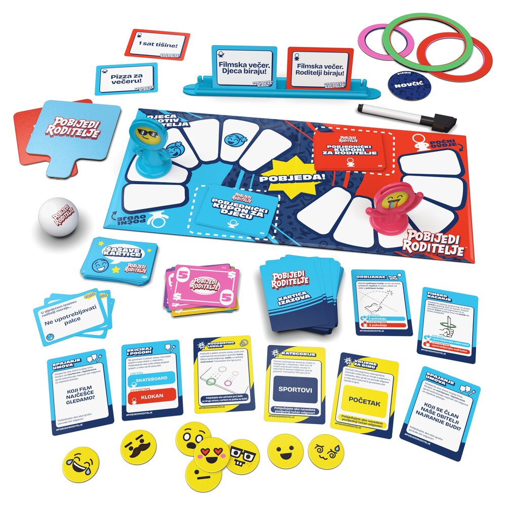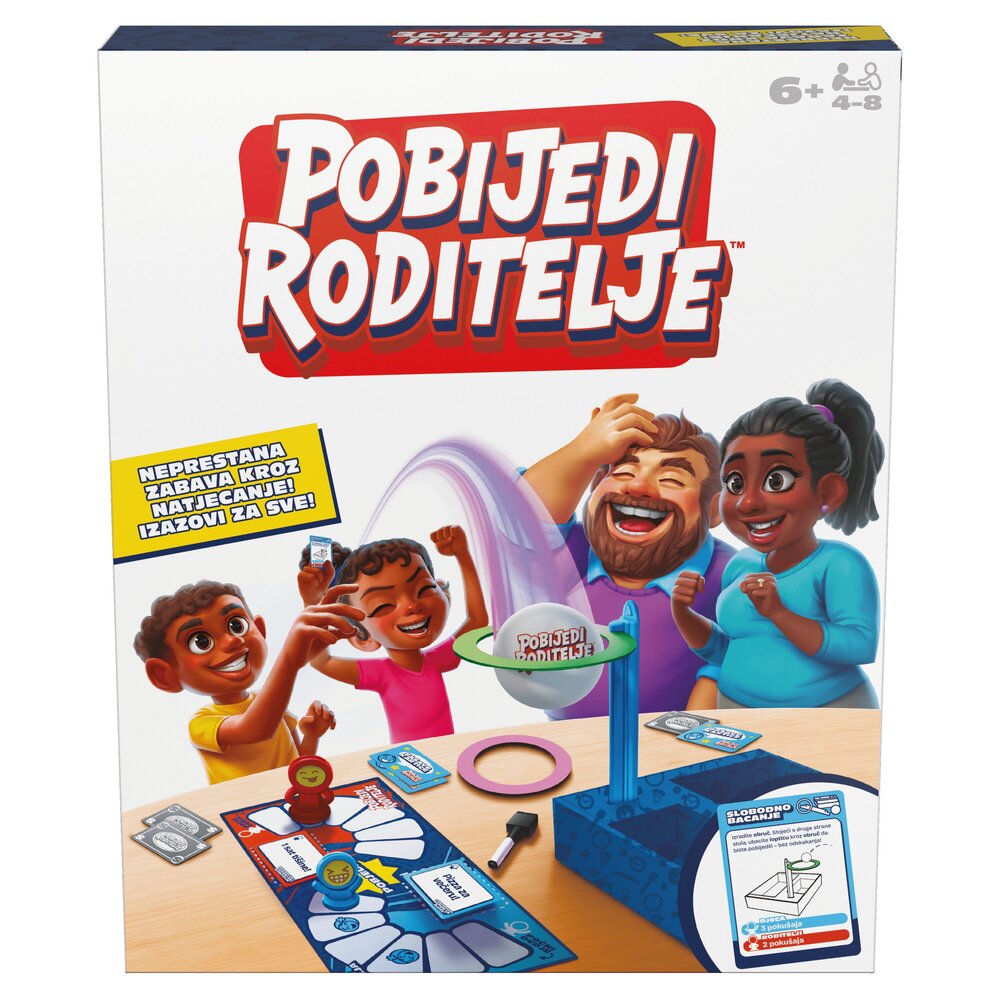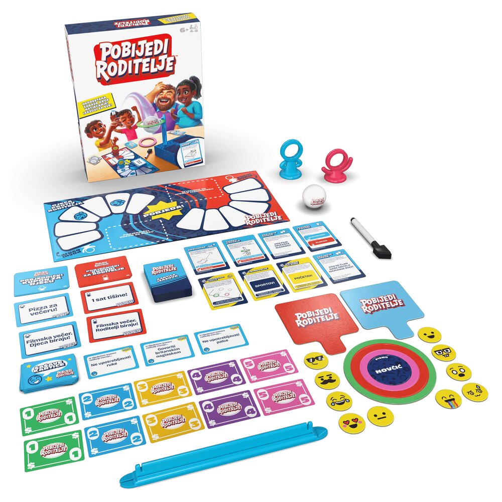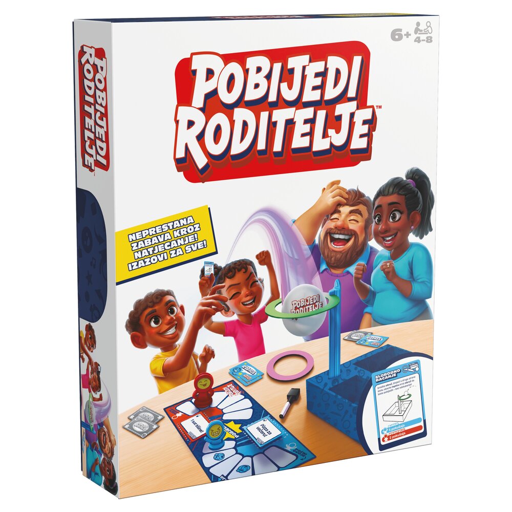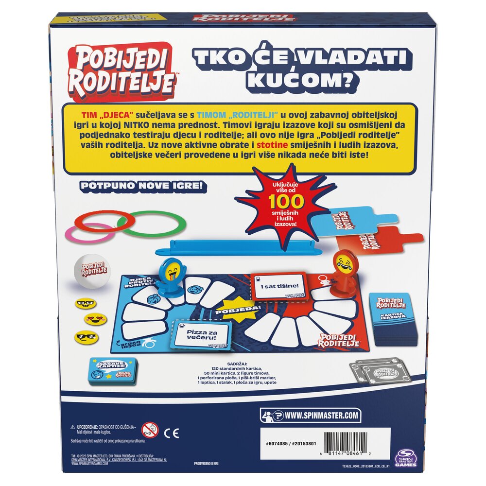 Nova verzija hit igre Pobijedi roditelje donosi još više smijeha, natjecanja i urnebesnih izazova za cijelu obitelj – Tim Djeca i Tim Roditelji suočavaju se u jednakim uvjetima kroz fizičke izazove, generacijske trivije i viralne zadatke, a dodatna čar igre je u 3D preprekama koje se slažu od elemenata kutije – savršeno za obiteljske večeri pune buke i zabave! Sadržaj: igraće karte, izazovi, trivia pitanja, ploča s preprekama i 3D elementi za slaganje, broj igrača: 4–8, preporučena dob: 6+, baterije: ne.