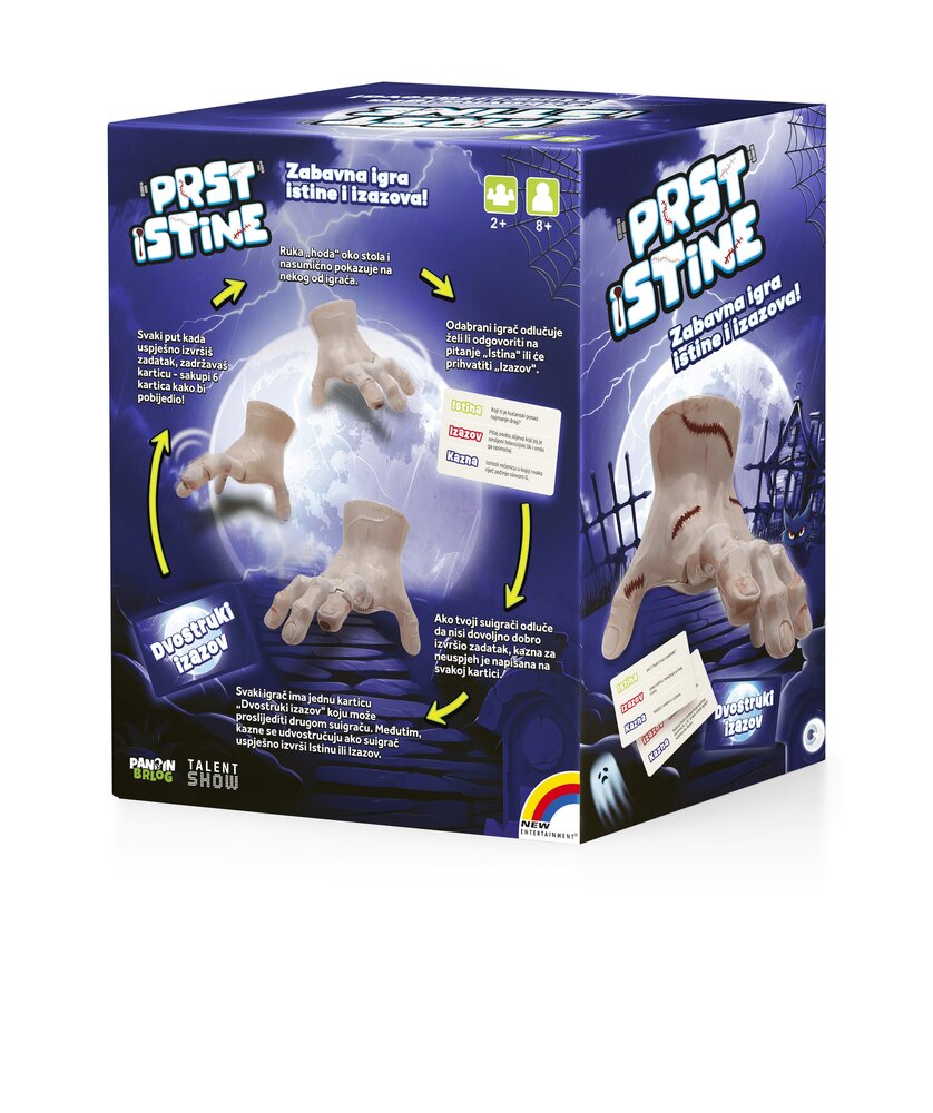 Novo izdanje igre Prst istine donosi još više uzbuđenja! Klince će oduševiti neobična ruka “koja” hoda površinom stola i nasumično bira igrača.Kada izabere igrača, on može birati želi li ispuniti izazov ili odgovoriti na pitanje. Ukoliko tvoji suigrači odluče da zadatak nije ispunjen, slijedi kazna koja se nalazi na svakoj kartici. Inovativna elektronska ruka neobičnog izgleda donosi element iznenađenja i zabave, čineći igru dinamičnom i atraktivnom za djecu. Idealna je za grupne aktivnosti jer potiče interakciju i smijeh među igračima. Igra je namijenjena za 2+ igrača. Preporučena dob: 8+.