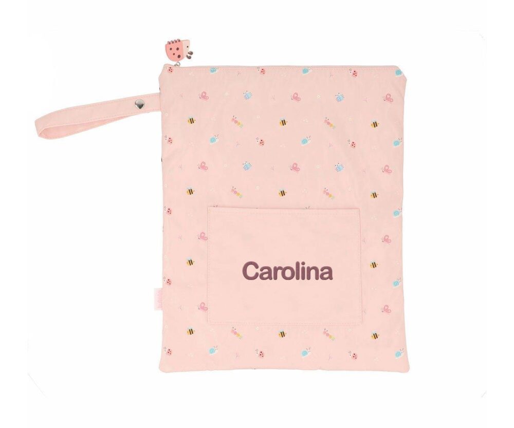 The waterproof bags adorned with the new back-to-school collections from Tutete are very practical for taking a change of clothes to preschool, storing swimming clothes, or as a bag for storing underwear when you travel.Their wide storage space, zip closure, and the handle with a snap button make them a very comfortable and versatile bag.It features an open front outer pocket that you can personalize with your child’s name without losing its waterproof quality.Discover the full Bugs collection from Tutete by clicking HEREFeaturesCan be personalized with up to 12 charactersExterior composition: 100% polyesterInterior composition: Waterproof membraneMeasurements: height 40cm x width 31.5cmZip closureOpen front outer pocketHas a handle with a snap button for carrying on the stroller or by handMachine washable at 30°Do not tumble dry
