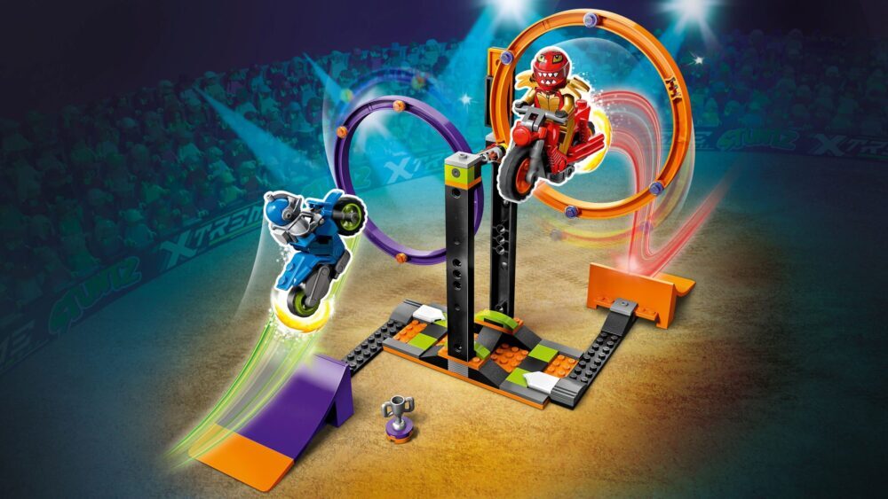 Pripremi se za LEGO® City Vrteći vratolomni izazov! Testiraj svoje vještine, organiziraj epske događaje ili se natječi s prijateljima ili obitelji. Učvrsti obruče, pokreni motocikl na zamašnjak i velikom brzinom zaleti se na rampu da izvedeš savršen skok. Zatim odvoji obruče i zavrti ih da zapapriš izazov. Tko će odnijeti pobjednički trofej? Saznat ćeš. Sretno!