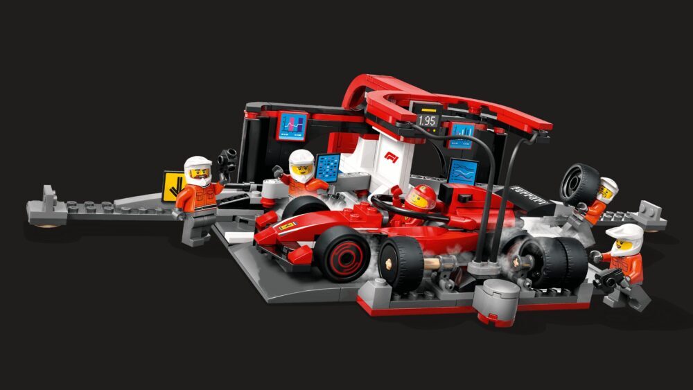 Opremi se za brzu akciju u boksu tima Ferrari u utrci F1®! Okupi posadu u boksu i pozovi Ferrarijeva vozača, neka dojuri munjevitom brzinom. Pregledaj motor, pripremi nove glatke gume i zavrti kotače udarnim pištoljem da ih brzinski promijeniš. Izjuri iz boksa i nastavi se natjecati. Možda srušiš rekord za krug! Pripremi se za odlične pustolovine u boksu Formule 1 u LEGO® Cityju!