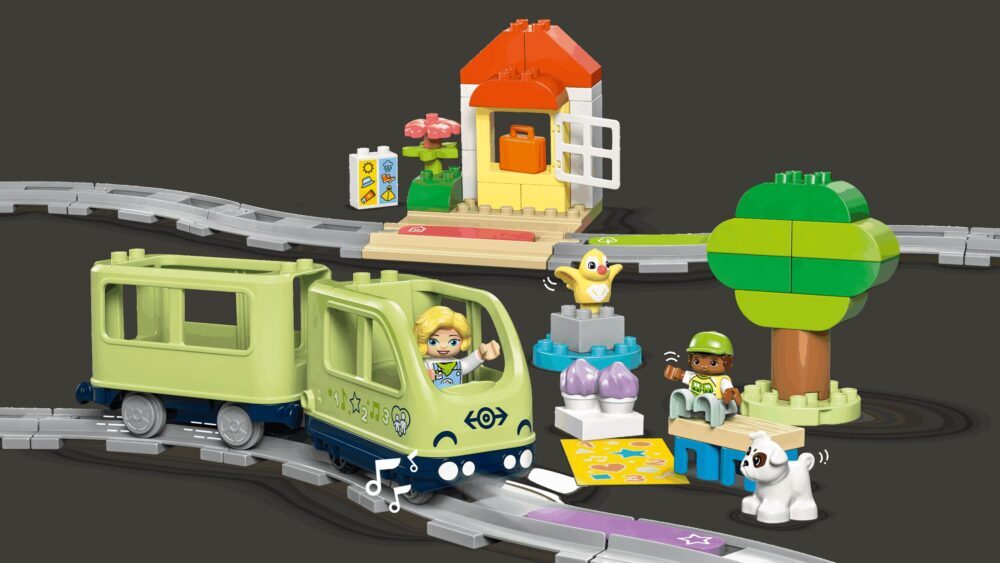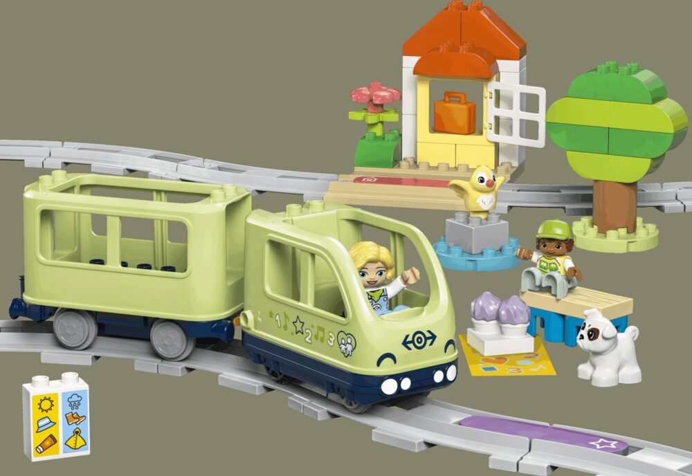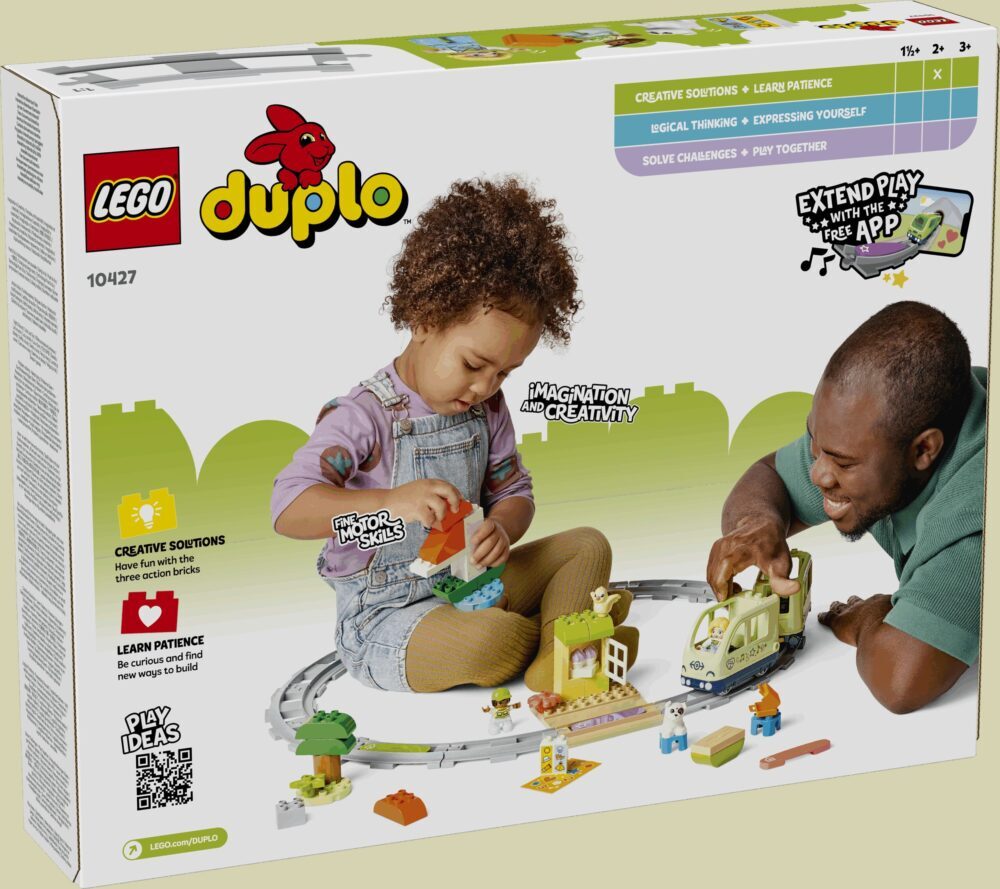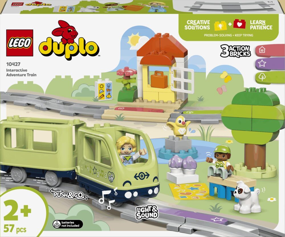 Mališani sjedaju na mjesto strojovođe u igrački za predškolsku djecu Interaktivni pustolovni vlak (10427). Uz model vlaka za djecu dobi 2+ predškolska djeca odlučuju o odredištu obiteljskog izleta, a onda kreću na putovanje puno svjetala, zvukova i novih informacija. Igračka za slaganje i preslagivanje ima mnogo kocaka za slaganje parka, plaže, željezničke postaje ili obiteljskog doma, pa mališani razvijaju znatiželju i kreativnost u slaganju. Edukativna igračka potiče strpljenje mališana i pomaže im da usavrše fine motoričke vještine i kreativnost dok su usredotočeni na slaganje tračnica i odlučivanje o smjeru putničkog vlaka. Igra oživljava uz pomoć 3 akcijske kocke zahvaljujući kojima vlak proizvodi realistične zvukove dok ih prelazi, a mališani razvijaju vještine predviđanja jer mogu pogađati koji će zvuk vlak proizvesti. Mogu upotrijebiti i posebnu kocku za prilagodbu te pustiti zvukove koje su sami snimili u besplatnoj aplikaciji LEGO® DUPLO® Interactive Trains, kojom mogu i voziti vlak koristeći se prijenosnim elektroničkim uređajem.