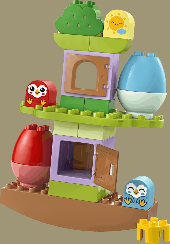 Poklonite djeci dinamičnu, lelujavu zabavu i igru u obliku edukativne igračke Stablo za ravnotežu i slaganje (10440). U šarenom kompletu za slaganje mališani od 18 mjeseci i stariji dobivaju bezbroj prilika za učenje, usvajanje vještina i zabavu s malim sovama u njihovoj slatkoj kućici na drvetu. Komplet za igru osmišljen je za predškolsku djecu i potiče razvoj vještina rješavanja problema i strpljenja dok djeca uče kako složiti elemente jedan na drugi tako da postignu ravnotežu. Mališani koji vole životinje mogu dodati kocke da stablo postane stabilno ili istraživati kućicu na drvetu s LEGO® DUPLO® sovama. Odrasli mogu iskoristiti kocku za dan i noć da pokažu mališanima kako su noćne ptice aktivne po mraku, a danju spavaju u jajima. Mališani vježbaju finu motoriku dok otvaraju jaja, a prepoznavanje boja dok povezuju sove s odgovarajućim jajima. Igračka iz prirode može se složiti na više načina, pa potiče dječju kreativnost i ustrajnost.