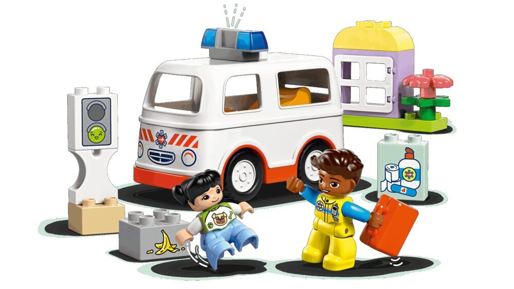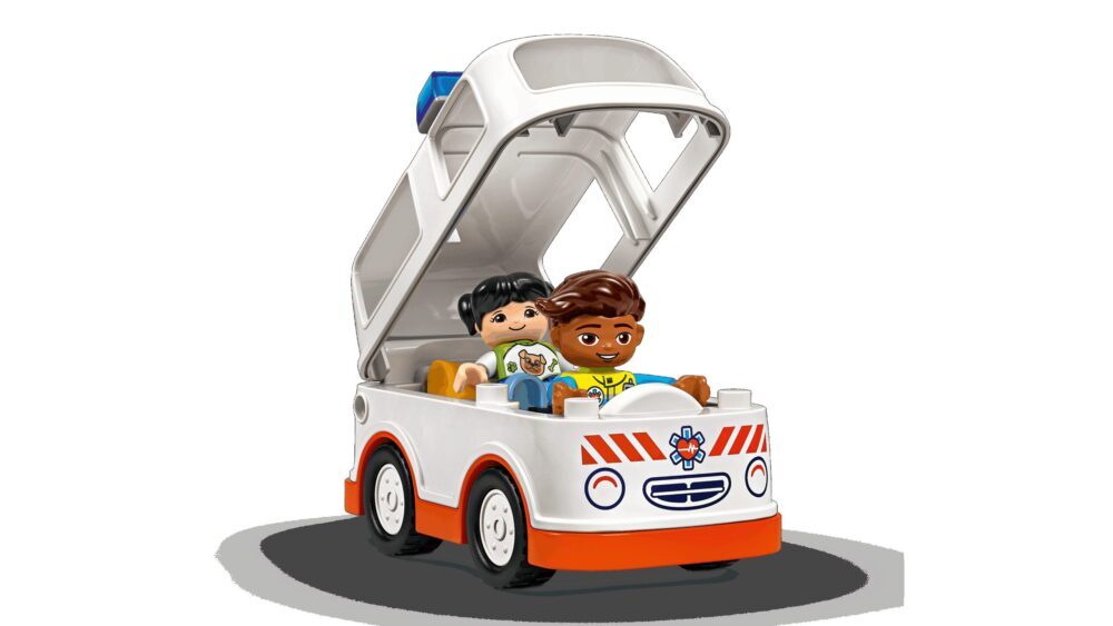 Brižni mališani pretvaraju se da sudjeluju u uzbudljivom spašavanju u kompletu Kola hitne pomoći i vozač (10447) za djecu predškolske dobi. Mališani dobivaju kola hitne pomoći koja mogu voziti i 2 LEGO® DUPLO® figure, bolničara i djevojčicu, za kreativnu i maštovitu igru. Kreativna igračka LEGO DUPLO odličan je poklon za malu djecu koja vole društvene i emocionalne aktivnosti učenja i osmišljena je tako da pomogne mališanima da nauče pokazivati empatiju. U uputama za slaganje nalazi se tiskani kotač emocija na kojem roditelji i predškolska djeca mogu istražiti osjećaje djevojčice. Na njemu mogu pokazati i kako se oni osjećaju kad su bolesni ili ozlijeđeni ili kako su se osjećali kad su prvi put vidjeli hitnu pomoć. Dok rekonstruiraju događaj, razvijaju logičko razmišljanje, a otvaranjem krova kola hitne pomoći i stavljanjem figure djevojčice na krevet razvijaju i fine motoričke vještine. Edukativna igračka za malu djecu pomaže predškolskoj djeci da razviju socijalne vještine dok istražuju kako bi se vozač hitne pomoći odnosio prema pacijentu.