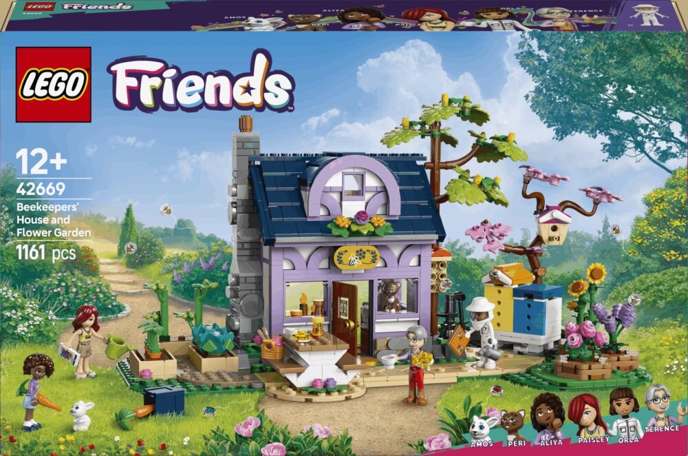 Otkrijte komplet za slaganje pun veselih trenutaka na suncu za tinejdžere i djecu koji vole kreativne projekte. LEGO® Friends Pčelarska kuća i vrt pun cvijeća (42669) odličan je dar za djecu od 12 godina i stariju. U kompletu dobivaju kuću na kat i vrt te 4 lika iz serije LEGO Friends, figuru mačke i figuru zeca. Ljubitelji prirode ponosno će izložiti model pčelarske kuće s vrtom. U kompletu Paisley i Aliya posjećuju Paisleyne baku i djeda pčelare, a krase ga slatki detalji i iznenađenja na svakom koraku. Pronađite slatke pločice s pčelom i bubamarom te cvijeće i drveće oblikovano prema stvarnim biljnim vrstama. Zabavni dodaci uključuju paket sjemenki, kantu za zalijevanje, kantu za kompost, klupko vune i druge elemente. Saznajte kako se pravi med uz pomoć košnica unutar kojih je saće. Među realističnim su detaljima pčelarski zaštitni šešir i dimilica. Brinite se o cvijeću pa obiđite spavaću sobu ili trgovinu u kojoj baka i djed prodaju sjemenke, svijeće, saće i med.