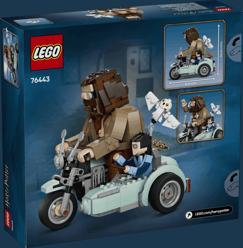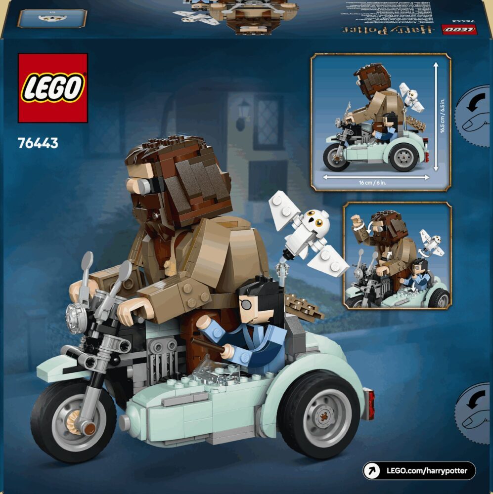 Čvrsto se uhvati, krećemo prema Jazbini na Hagridovu letećem motociklu! Odglumi dramatične prizore iz filma Harry Potter i darovi smrti™ ili smisli nove priče s detaljnim modelom. Vozi motocikl s poludivom Hagridom™ i Harryjem Potterom™ u prikolici u pratnji sove Hedvige™. Ili jednostavno izloži čarobnim model u svojoj kolekciji kompleta LEGO® Harry Potter od kocaka!
