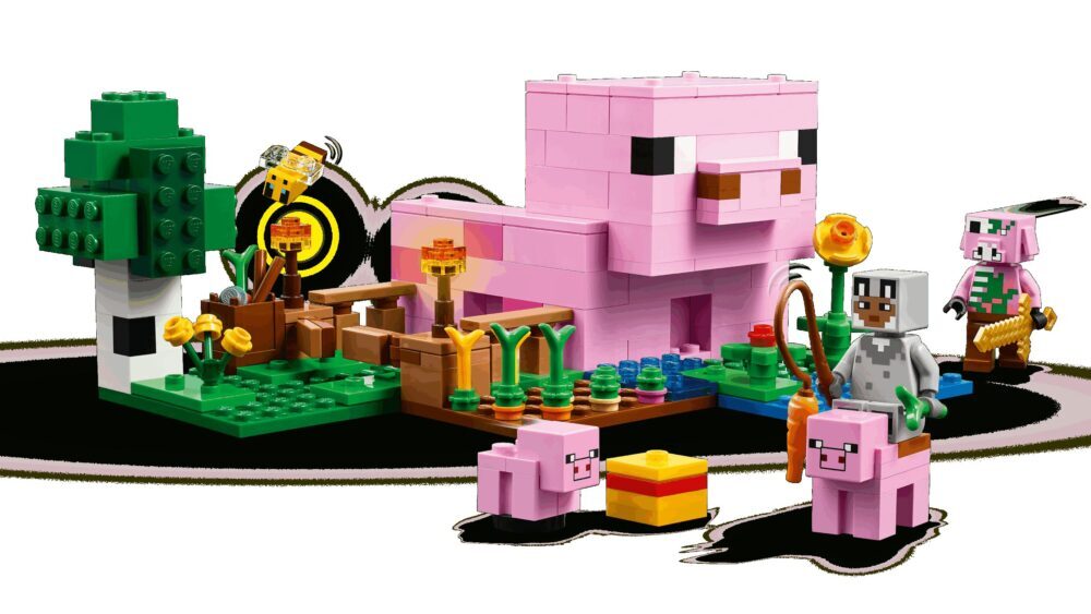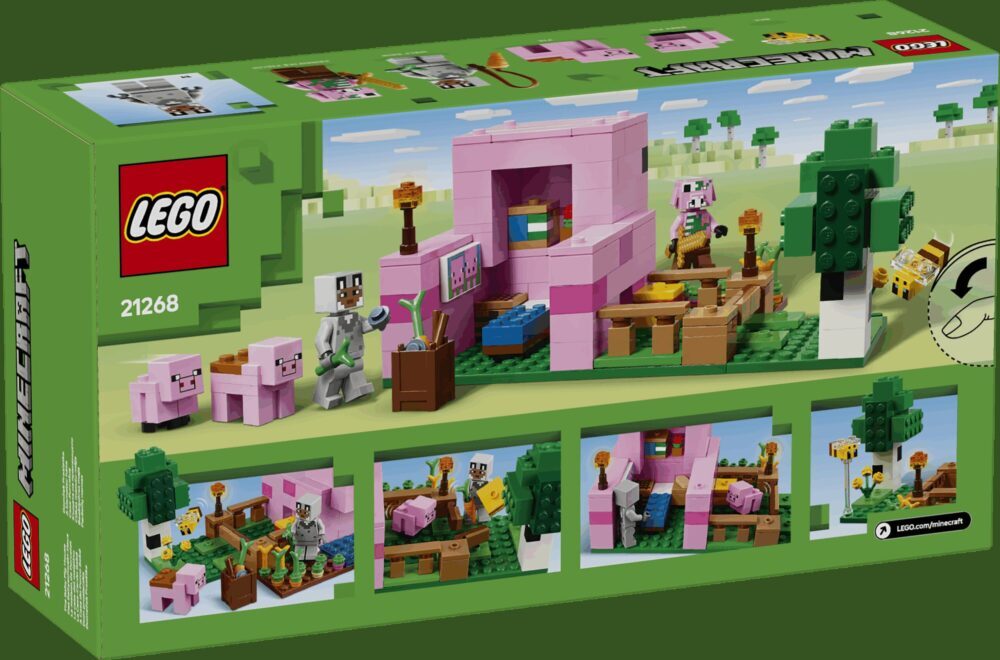 Kuća mala svinja (21268) savršena je igračka za obožavatelje igre Minecraft® koji vole brinuti o domu, životinjama i farmi. Igračka za aktivnu igru za djevojčice i dječake odličan je poklon za rođendan, blagdan ili bilo koji drugi dan za djecu od 7 godina i stariju. Igračka za kreativnu brigu o domu dolazi iz šumskog bioma Minecrafta i uključuje mnoge figure iz popularne videoigre: lik junaka u vučjoj maski, malu svinju, pčelu, odraslu svinju i piglina zombija. Djeca mogu ponoviti akciju iz igre pa osedlati odrasle svinje i mamiti ih mrkvom na štapu da projašu kroz kuću u obliku svinje i vrtu. Na farmi rastu krumpir i repa, a do polja vode vrata kroz koja mala svinja može proći. Djeca izbjegavaju piglina zombija koji im želi zasmetati tako da uđu u kuću s krevetom, policom i stolom za crafting koji potiče na maštovitu igru. U aplikaciji LEGO® Builder djeca mogu približavati i okretati trodimenzionalne modele na uređaju i još više se zabaviti.