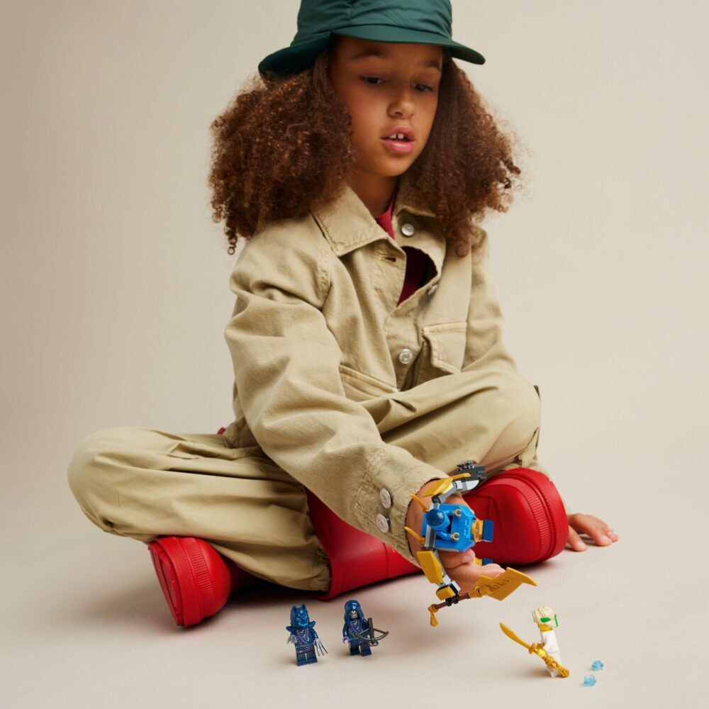 Dječaci i djevojčice uzrasta 6+ mogu odglumiti u akcijskim prizorima borbe iz 2. sezone televizijske serije NINJAGO® Dragons Rising u Paketu s Jayevim mehaničkim borcem (71805). Igračka za slaganje s ninjom za djecu dolazi s fora figurom robota s pomičnim rukama, nogama i trupom koja maše velikim zlatnim mačem i ispaljuje elemente iz 2 pucača.