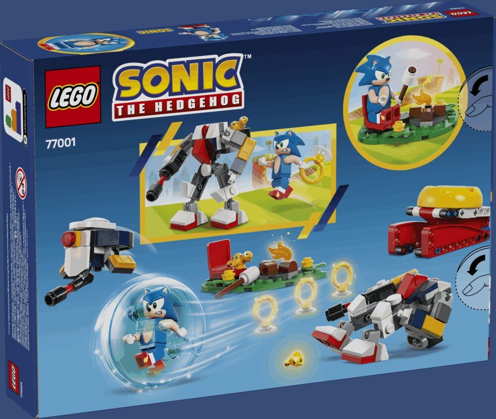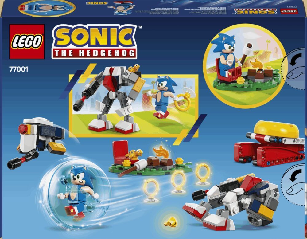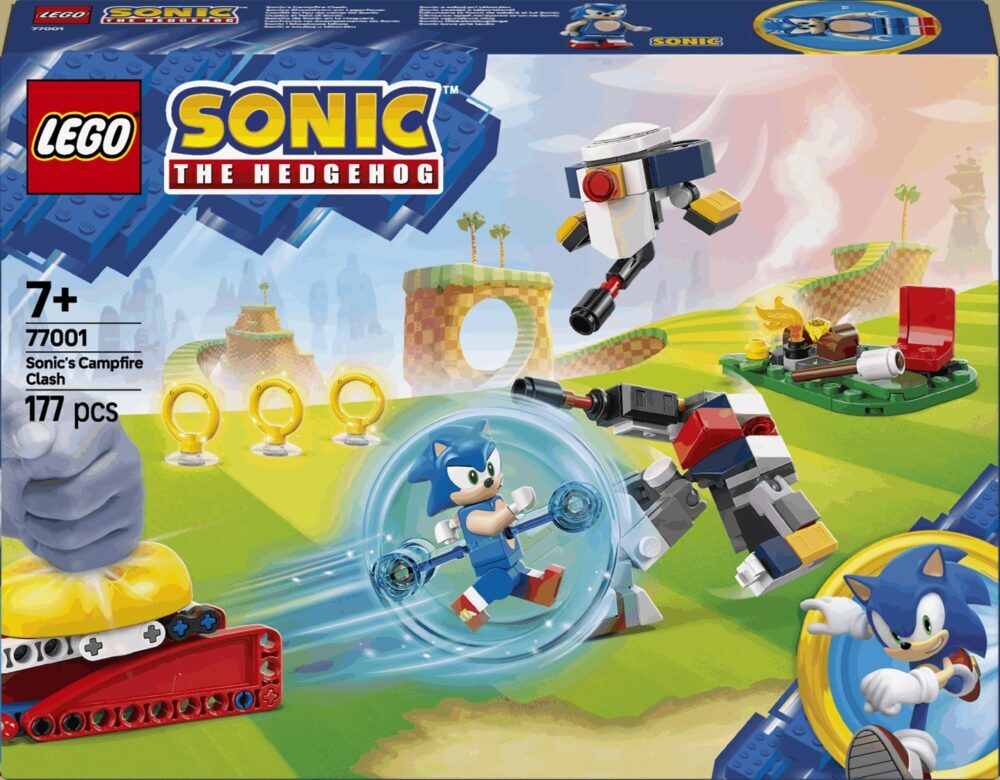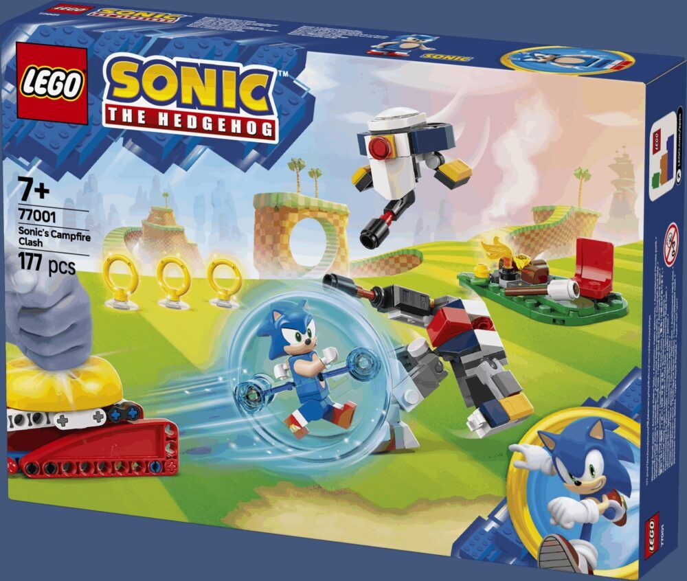 Pustolovine i zabava čekaju obožavatelje videoigre od 7 godina i starije u kolekcionarskom kompletu Sonic i sukob kraj logorske vatre (77001). Igračka iz linije LEGO® Sonic the Hedgehog™ sadržava model prostora s logorskom vatrom, kuglu za jurnjavu i ispaljivač te dodatke, kao što su smaragd kaosa i 3 zlatna prstena. U kompletu iz videoigre su i 4 figure likova iz priča o Sonicu: figurica Sonica, „leteći” robotski dron G.U.N. Beetle, pomična robotska figura G.U.N. Hunter i Tocky. Interaktivna igračka s mnogo elemenata iz priča o Sonicu za dječake i djevojčice zabavan je komplet za igru koji potiče djecu i obožavatelje da smisle nove priče za igru pretvaranja sa Sonicom i neprijateljskim robotima, od opuštanja uz logorsku vatru do spašavanja Tockyja i osvajanja 3 zlatna prstena. Možete proširiti kreativnu zabavu jurnjave s drugim igračkama iz linije LEGO Sonic the Hedgehog (kompleti se prodaju zasebno). Djeca mogu uživati i u intuitivnoj pustolovini slaganja u aplikaciji LEGO Builder u kojoj mogu približavati i okretati modele, spremati komplete i pratiti napredak.