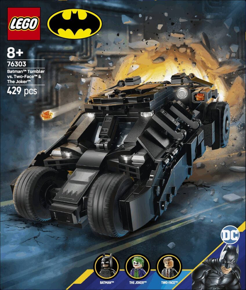 Batman™ s Tumblerom protiv Two Facea™ i Jokera™ (76303) zabavna je igračka za djecu koja vole Batmana, vozila, kreativnost LEGO® svijeta i pustolovine sa superjunacima™. Poklonite malim superjunacima od 8 godina i starijima akciju u Batmanovu autu iz LEGO kompleta s legendarnim vozilom Tumbler Batmobile™ iz klasičnog serijala Vitez tame™. U LEGO kompletu sa superjunakom Batmanom dobivate 3 figurice popularnih likova: Batman s Batarangom™, Joker s novcem u ruci i Two-Face s prepoznatljivim srebrnim novčićem. Složivi Tumbler Batmobile može se otvoriti, a unutra su kontrolna ploča i kabina za Batmana. Iz ispušne cijevi vozila izlazi element plamena koji možete ukloniti. Bat-Signal™ usmjeravate s pomoću projektora (ne svijetli) koji se može nagnuti i okretati za 360 stupnjeva u oba smjera. Graditelji koji žele dodatnu digitalnu zabavu mogu približavati i okretati 3D modele i pratiti napredak u zabavnoj, intuitivnoj aplikaciji LEGO Builder.