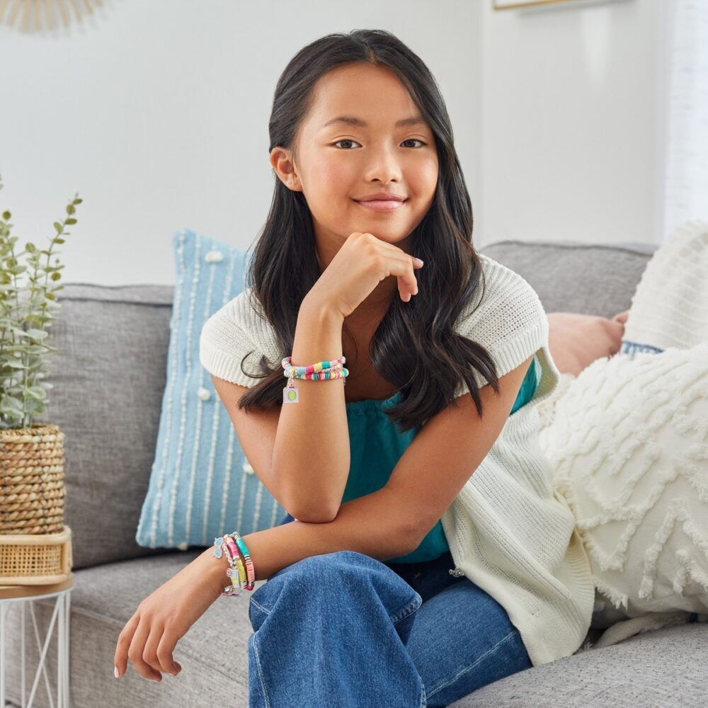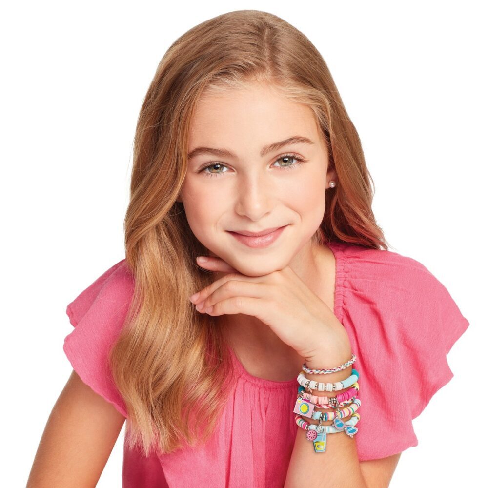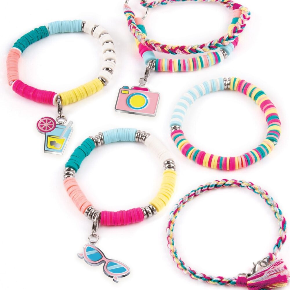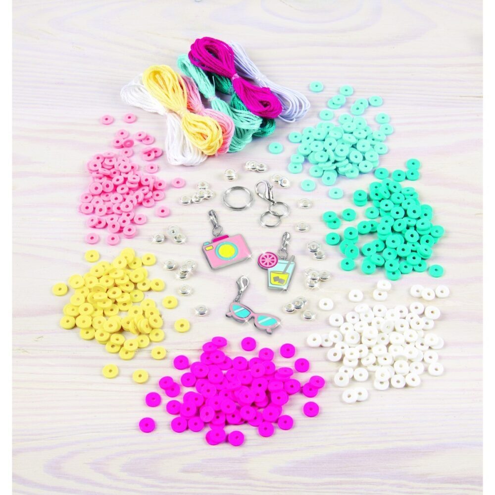 SADRŽAJ: ukupno 531 dijelova – za kreaciju 5 predivnih narukvica; 480 heishi perlica u 6 različitih boja (6×80), 35 srebrnih perlica, 1 elastična traka 2m, 1 veliki metalni prsten, 1 mali metalni prsten, 1 kopča, 6 boja vezenih traka od 2 m, svaka, 3 privjeska, pomoćno šilo, upute, podloga za igru.