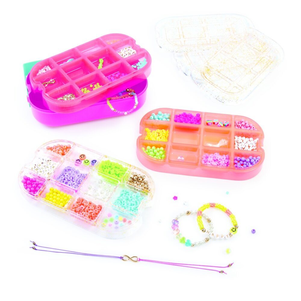 Zahvaljujući praktičnoj ručki, djeca mogu lako ponijeti set sa sobom na druženja ili ga koristiti gdje god ih inspiracija ponese! Set uključuje sve što je potrebno za mlade dizajnere nakita da odmah započnu s kreiranjem – od elastičnih i najlonskih konaca do čak 1370 modernih perlica.
