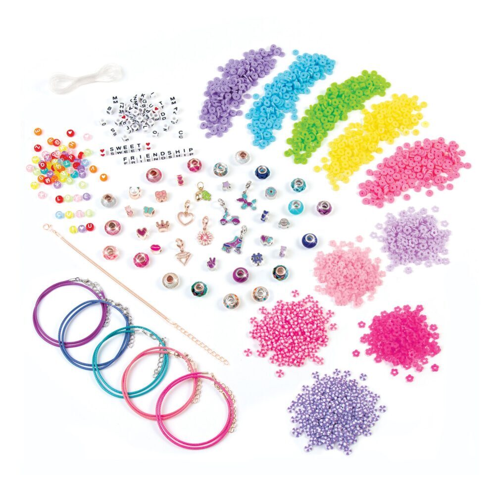 Ovaj ekskluzivni set omogućuje vam izradu više od 30 unikatnih narukvica pomoću elastičnih traka, raznovrsnih privjesaka i više od 2100 perli. Uz bogatu kolekciju privjesaka, heishi perli i abecednih perli, možete izrađivati narukvice prijateljstva koje ćete podijeliti sa svojim prijateljicama.