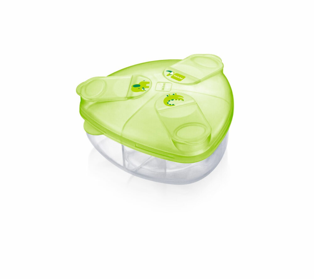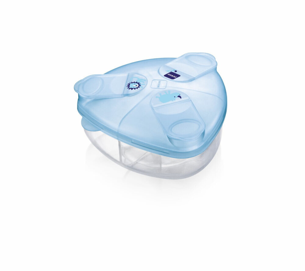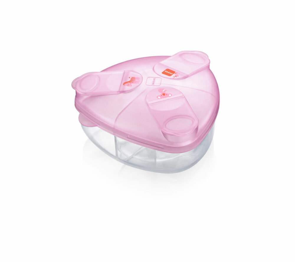 Možete spremiti do tri porcije mlijeka u prahu ili formule u praktični spremnik za disperziju. Zbog trokutastog oblika, mlijeko u prahu možete jednostavno sipati u bocu, a da ne ostavi nečistoću. Idealno za aktivne roditelje i u pokretu.