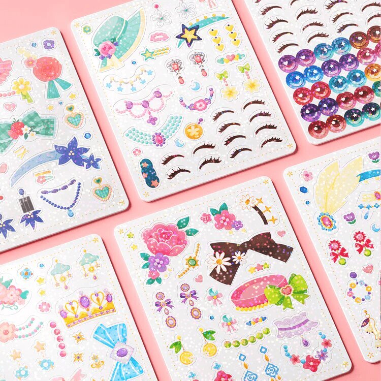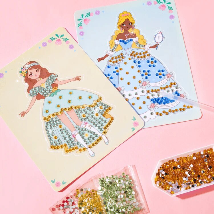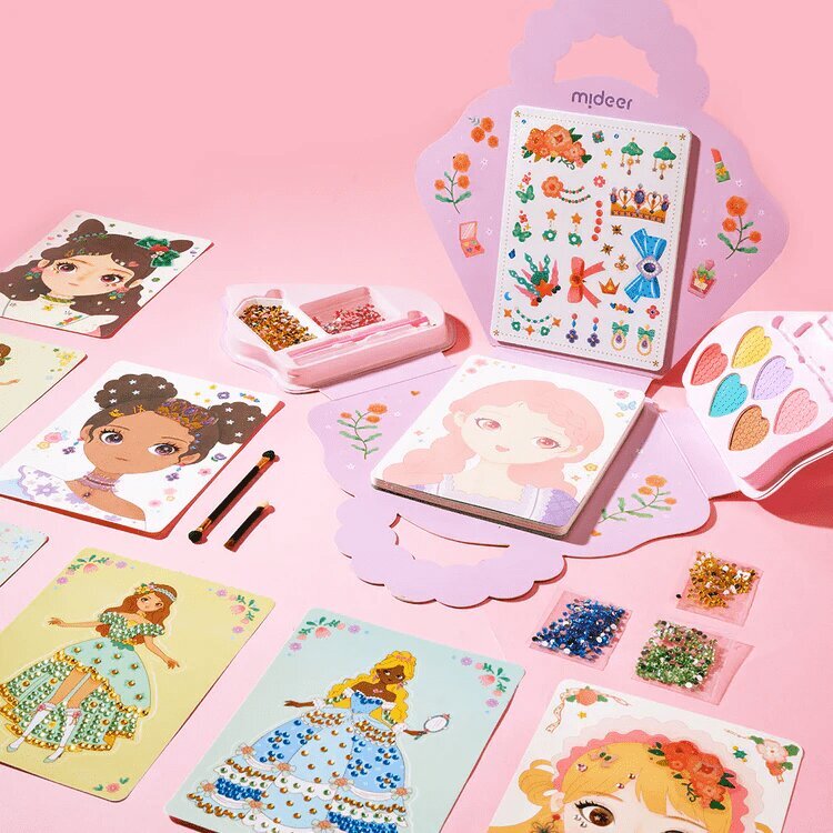 Sadržaj pakiranja: 20 predložaka za šminkanje princeza, 4 predloška s dijamantnim naljepnicama, 4 scratch art predloška, 4 seta naljepnica, 6 boja, 900 dijamanata, 1 tanjur, 1 olovka za nanošenje dijamanata, 1 ljepilo, 2 kista