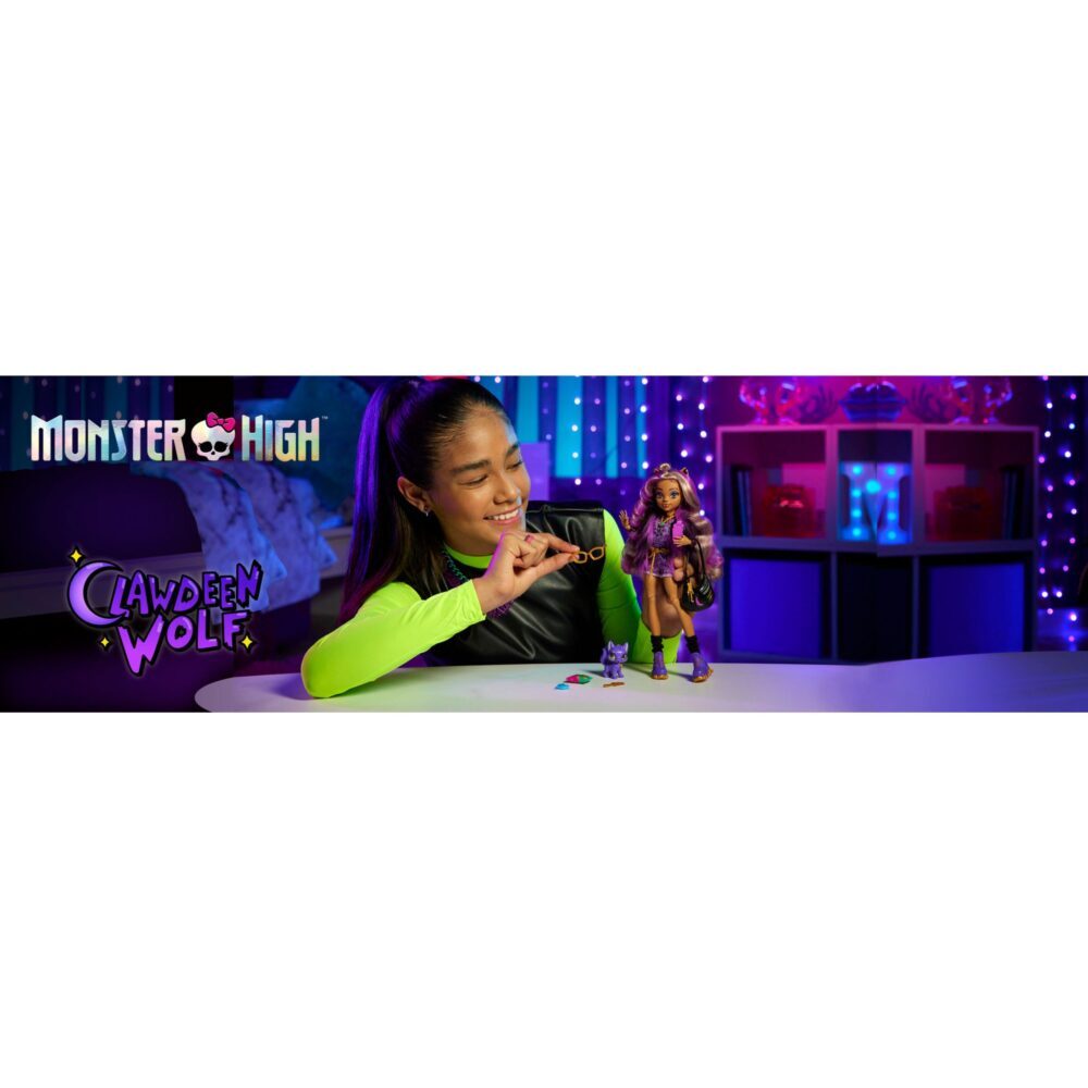 Clawdeen se šeće Monster High hodnicima u pandžastome stilu s džemperom sa životinjskim printom i majicom dugih rukava s uzorkom polumjeseca. Njen otkačen izgled inspiriran vukodlacima upotpunjen je jezivim tenisicama, crnom torbicom, zlatnim naočalama i nakitom. Podignite izgled lutke Clawdeen Wolf na višu razinu s opakim prslukom od umjetnog krzna i zastrašujućim šik dodacima.