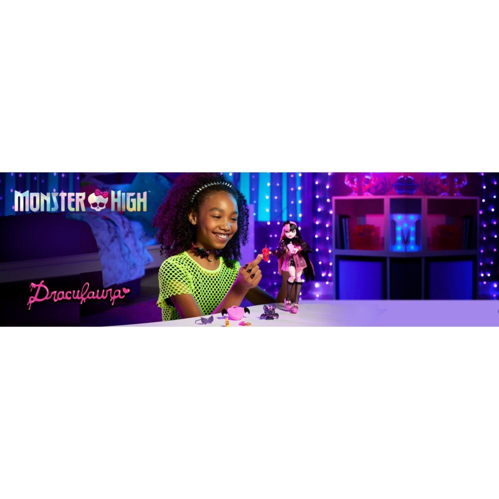 Draculaura se šeće Monster High hodnicima u očnjak-tastičnom stilu u kratkim hlačama s printom srca i vampirskom korzet bluzom s prozirnim rukavima. Njen otkačen, vampirima inspiriran, izgled je upotpunjen prozirnim čarapama s volanima, ružičastim cipelama na platformu, trakom i sunčanim naočalama sa šišmiš detaljima. Podignite izgled lutke Draculaura na višu razinu sa zastrašujućim šik plaštem i dodacima.