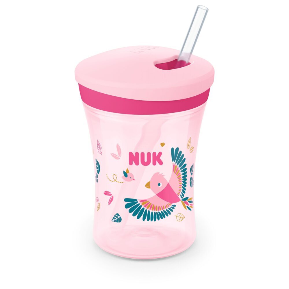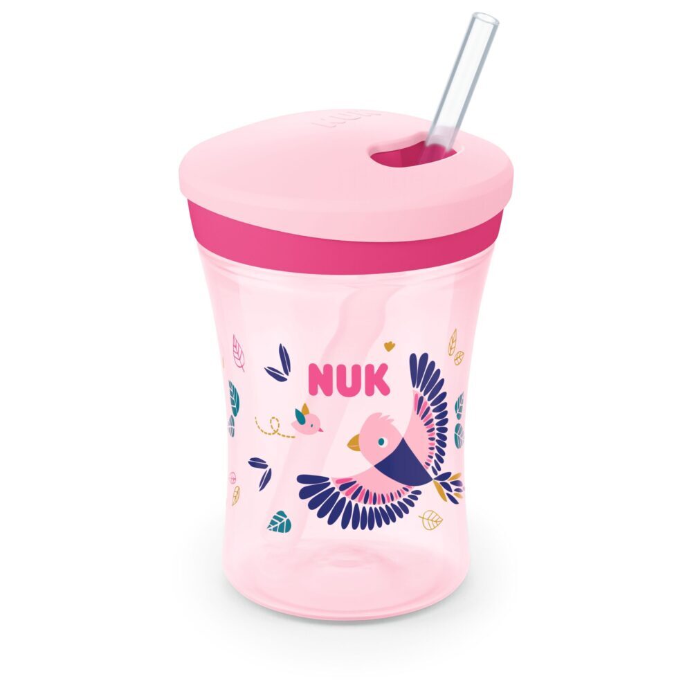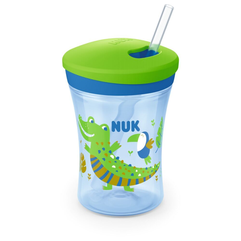 NUK ACTION CUP je posebno dizajnirana bočica za djecu od 12 mjeseci nadalje i nije namijenjen hranjenju dojenčadi, sa slamkom. Dodatan naziv Cameleon dodijeljen je zbog efekta koji omogućuje promjenu boja sličica prilikom ulijevanja tople tekućine. Fleksibilna slamka nježna je za dječje desni. Integrirani ventil zraka za pruža nesmetani protok pića tijekom pijenja te sadrži okretljivi prsten, koji sprječava prolijevanje. Sastoji se od svega nekoliko dijelova koji se mogu brzo i lako sastaviti ili rastaviti što olakšava čišćenje.