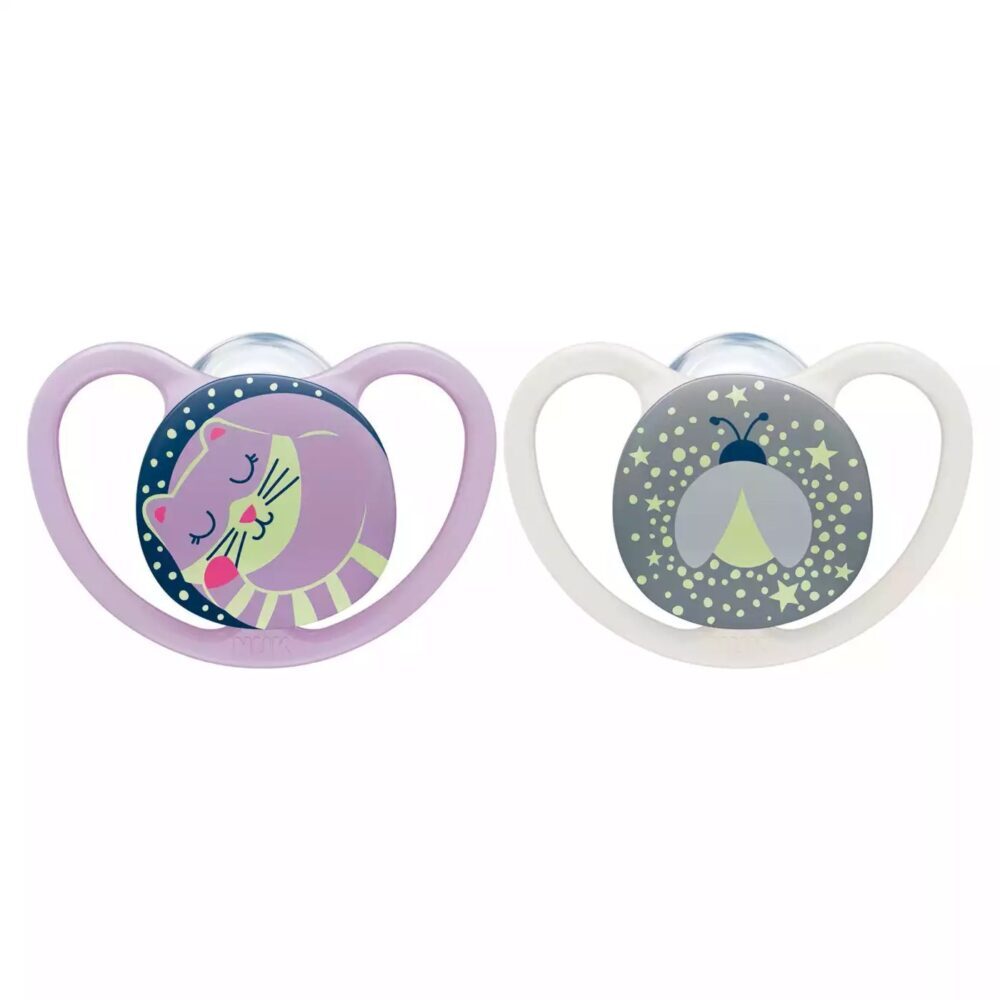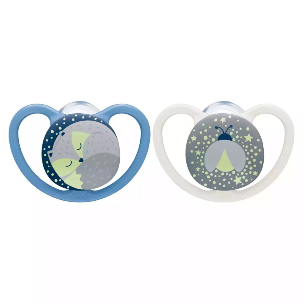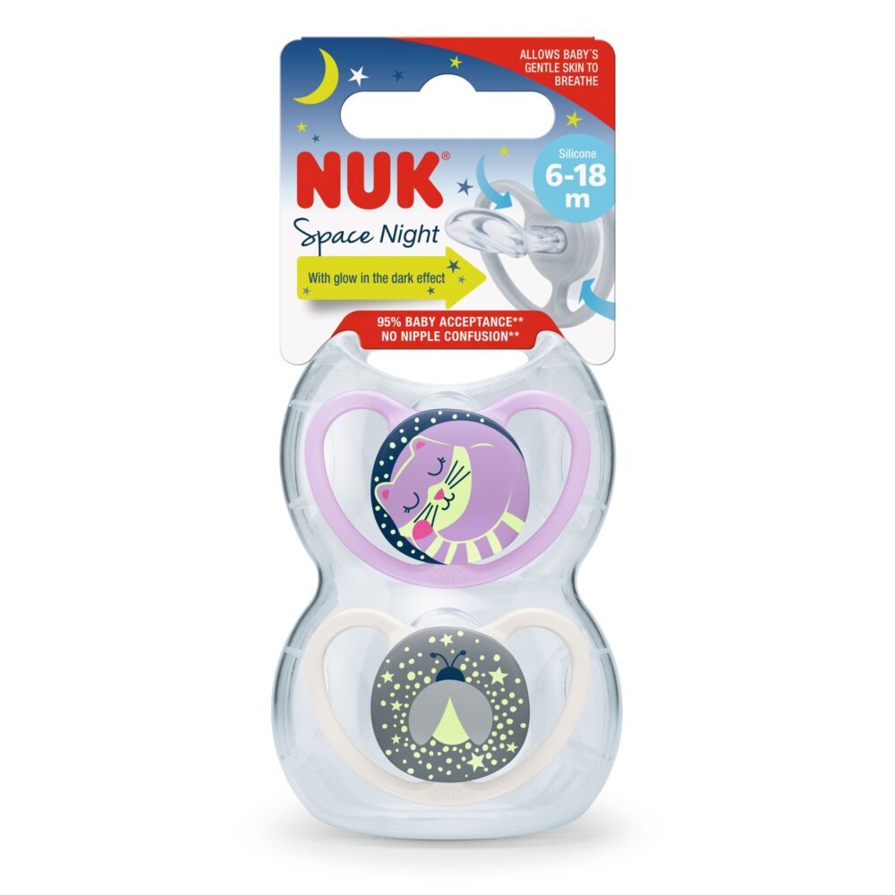 Duda sa silikonskim sisačem za djecu od 6-18 mjeseci. Bez štetnih tvari, bez mirisa, prozirna i glatka površina sisača. Pakiranje sadrži dva komada. Space Night dude svijetle u mraku i imaju ortodontski oblik sisača NUK i uz još uži i tanji vrat, smanjuje pritisak na zube i nepce bebinih usta.