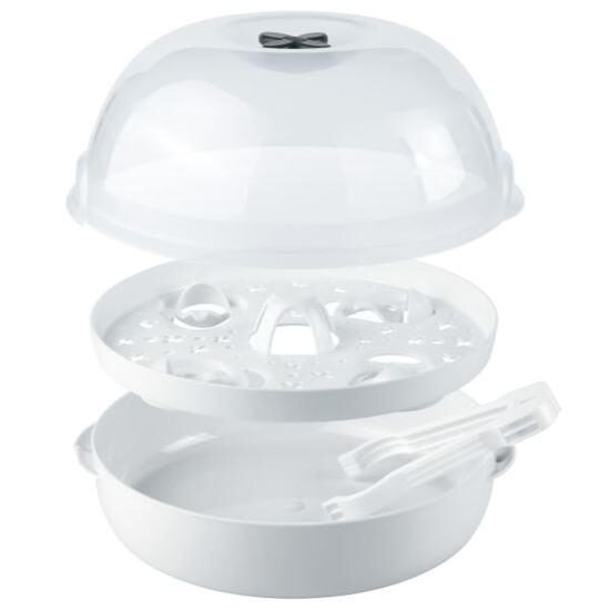 Mikrovalni parni sterilizator NUK Micro Express Plus dezinficira dječje bočice i dude pomoću vruće dezinfekcije na bazi pare. Istovremeno se mogu dezinficirati do četiri boce od 300 ml. Zahvaljujući inteligentnom držaču, boce su odmah u pravom položaju za sušenje. Pomoću praktičnih hvataljki za bočice lako se uklanjaju dezinficirani dijelovi.