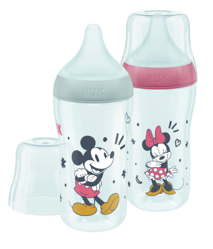 NUK Perfect Match plastična bočica zapremnine 260ml s omiljenim Disney likovima Mickey i Minnie Mouse. Na bočici od 260ml nalazi se sisač veličine M (od 3mj, za mliječnu hranu). Opremljena je sisačem koji je mekan i elastičan te se u potpunosti prilagođava vašoj bebi. *Sisač je prihvaćenod strane 98% beba. Širok i mekani jastučić za usne – pruža bebi poznati osjećaj poput majčine kože. Sisač s anti-colic funkcijom omogućuje bebi da opušteno pije. Indikator temperature. Bez BPA. Može se koristiti sa svim dodatcima NUK Perfect Matchte NUK Soft&Easy električnom izdajalicom.