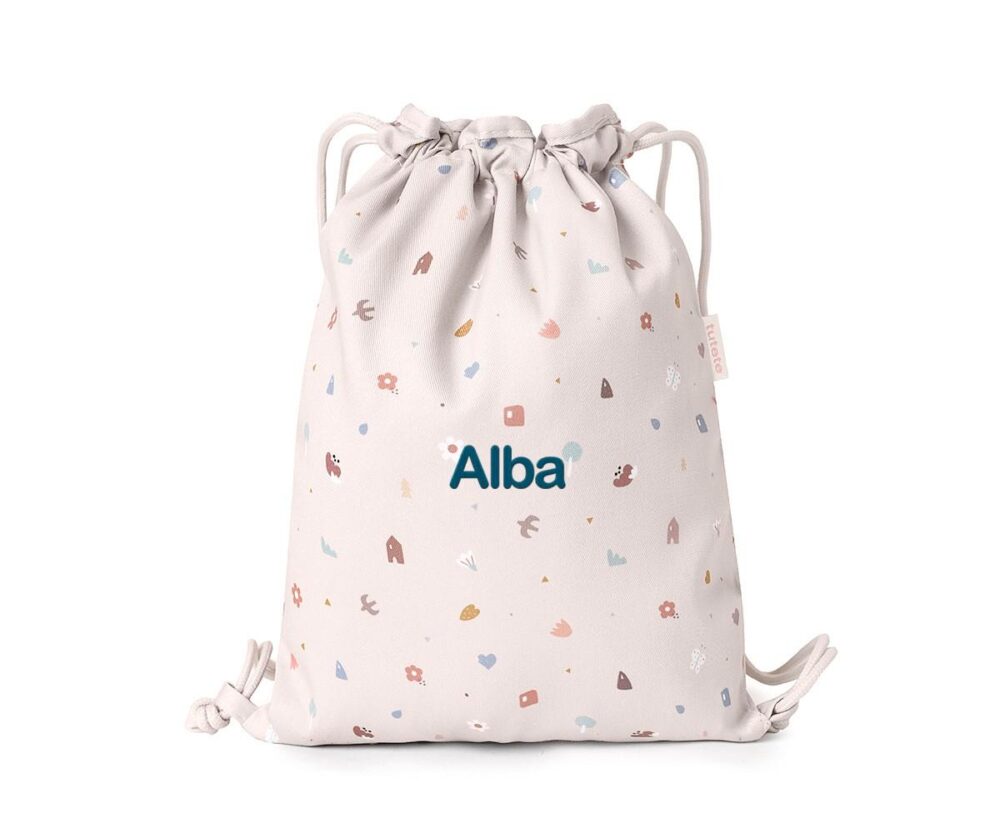 Tutete’s fabric drawstring backpack is perfect for children starting a new adventure at daycare or kindergarten. Perfect to bring a lunch, a change of clothes or small personal items, this light and functional backpack is easy to use and wash. In addition, it can be personalized with the name of your child on the outer pocket, making it unique and easy to identify.View all the lovely Tutete Geometric Nature collection items by clicking HERE FeaturesCan be personalized with up to 12 charactersThe arrangement of the drawings may vary and the embroidery may overlap, with the personalization possibly being on top of one of themComposition: 100% polyesterDimensions: height 34.5 cm x width 27.5 cmDrawstring straps on both sides to adjust it easilyMachine washable