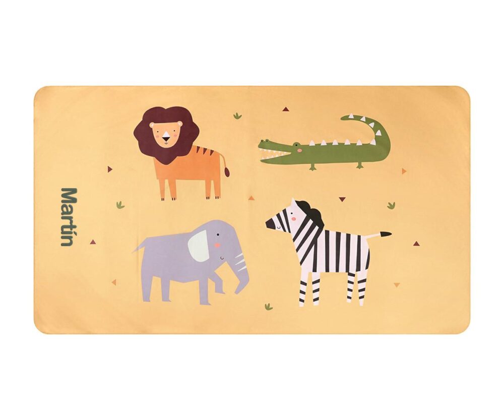 Monnëka’s Wild Animals Collection microfiber towel is perfect to use at the beach and by the pool. Its ultra-light, quick-drying fabric makes it a practical, comfortable and colorful option for sunny days.It also takes up very little space when storing it in its breathable mesh bag, ideal to carry it easily and always keep it dry and ready to use.You can personalize it with your child’s name, and even add a second line to include their last name, giving it a unique and personal touch.FeaturesComposition: 100% polyesterDimensions: 160cm x 90cmDries 3 times faster than a cotton towelTowel weight: 290grIncludes a breathable mesh carrying bag, making it easy to store and transport the towelIdeal for the beach or poolMachine washable at 40ºCID: 93520