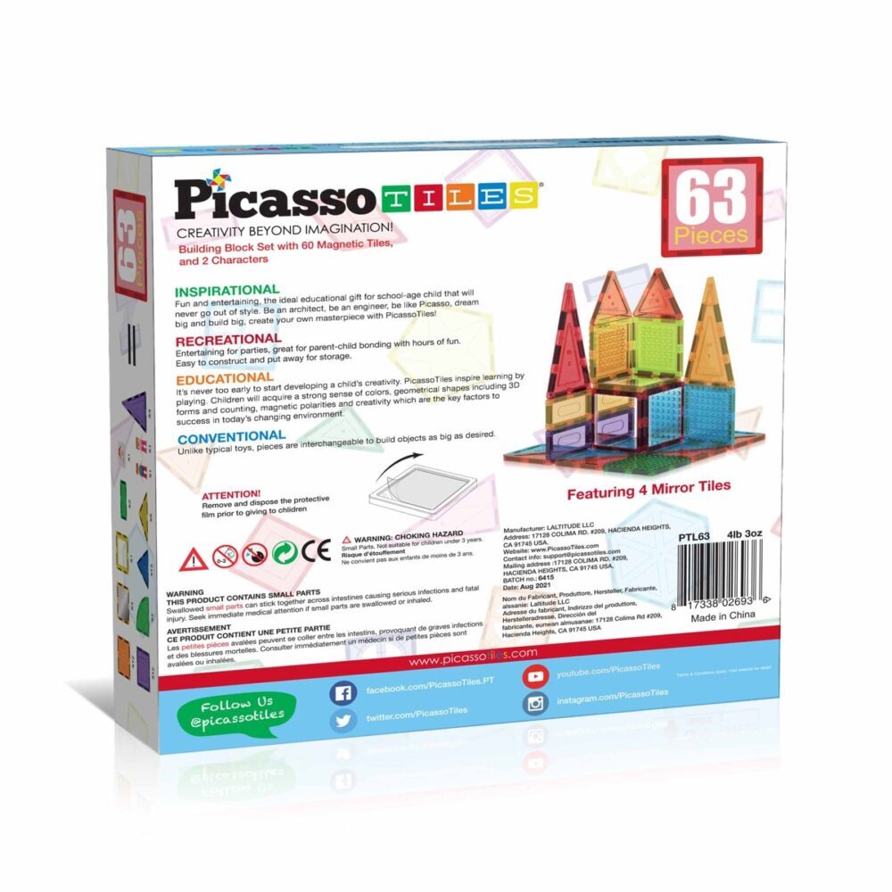 Otkrijte savršen spoj zabave i učenja s Picasso Tiles setom s kockicama od 63 dijela! Ovaj set poboljšan je s jačim magnetima koji mogu držati do 8 magnetskih pločica u dugom lancu. Uključuje i pločice s ogledalom te posebno dizajniranu magnetsku kocku koja se lako spaja s drugim pločicama.