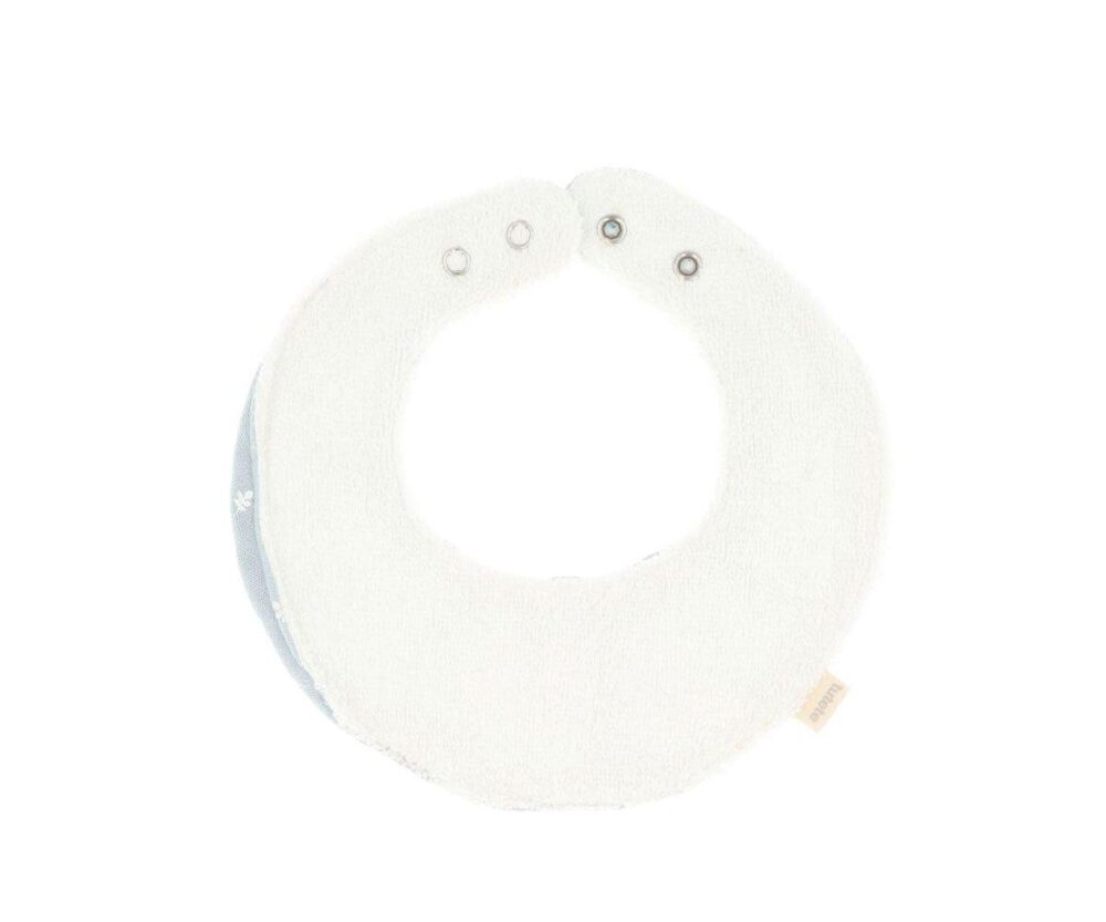 Frilled bib made of cotton muslin, perfect for when your baby begins the teething process.FeaturesMuslin material: 100% cottonInner part material: terry 100% cottonMeasurements: 19.5 cm diameterTwo snap closuresAbsorbentMachine wash cold on delicate cycleHandmade