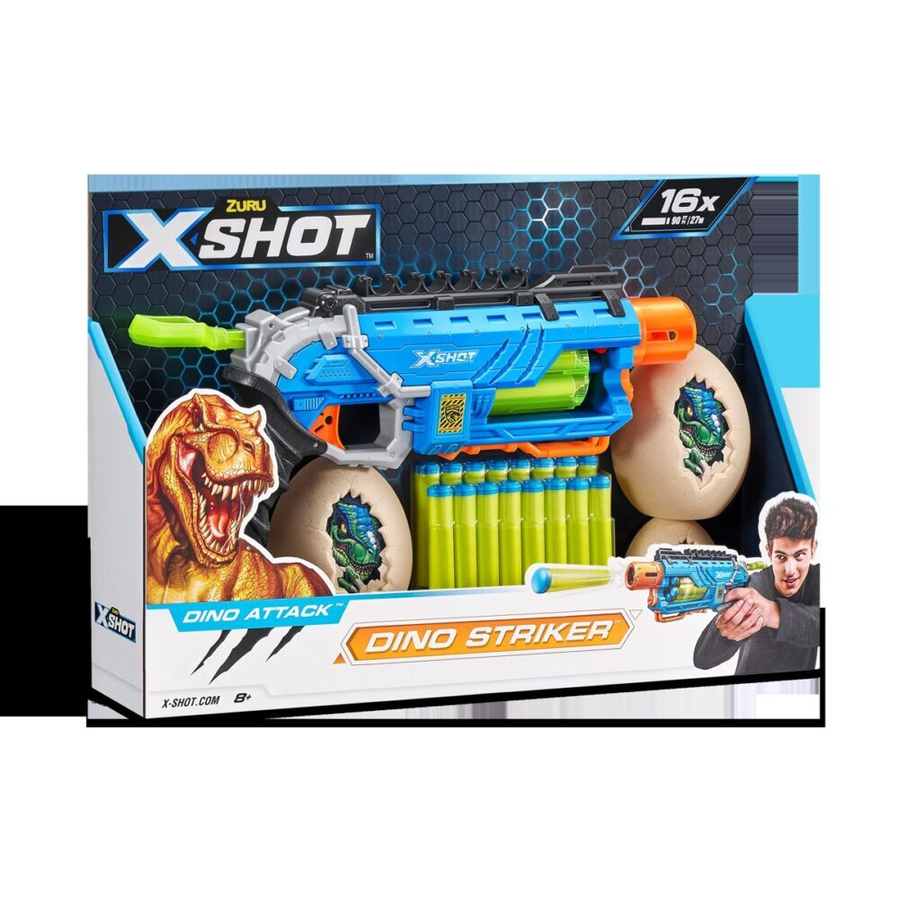 X-Shot Dino Attack Striker je blaster sa 6 strelica i samorotirajućom cijevi.